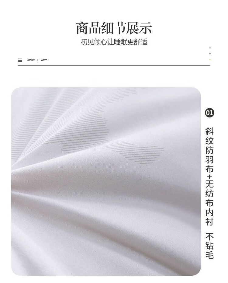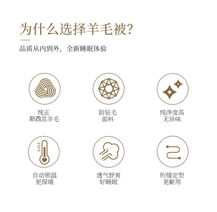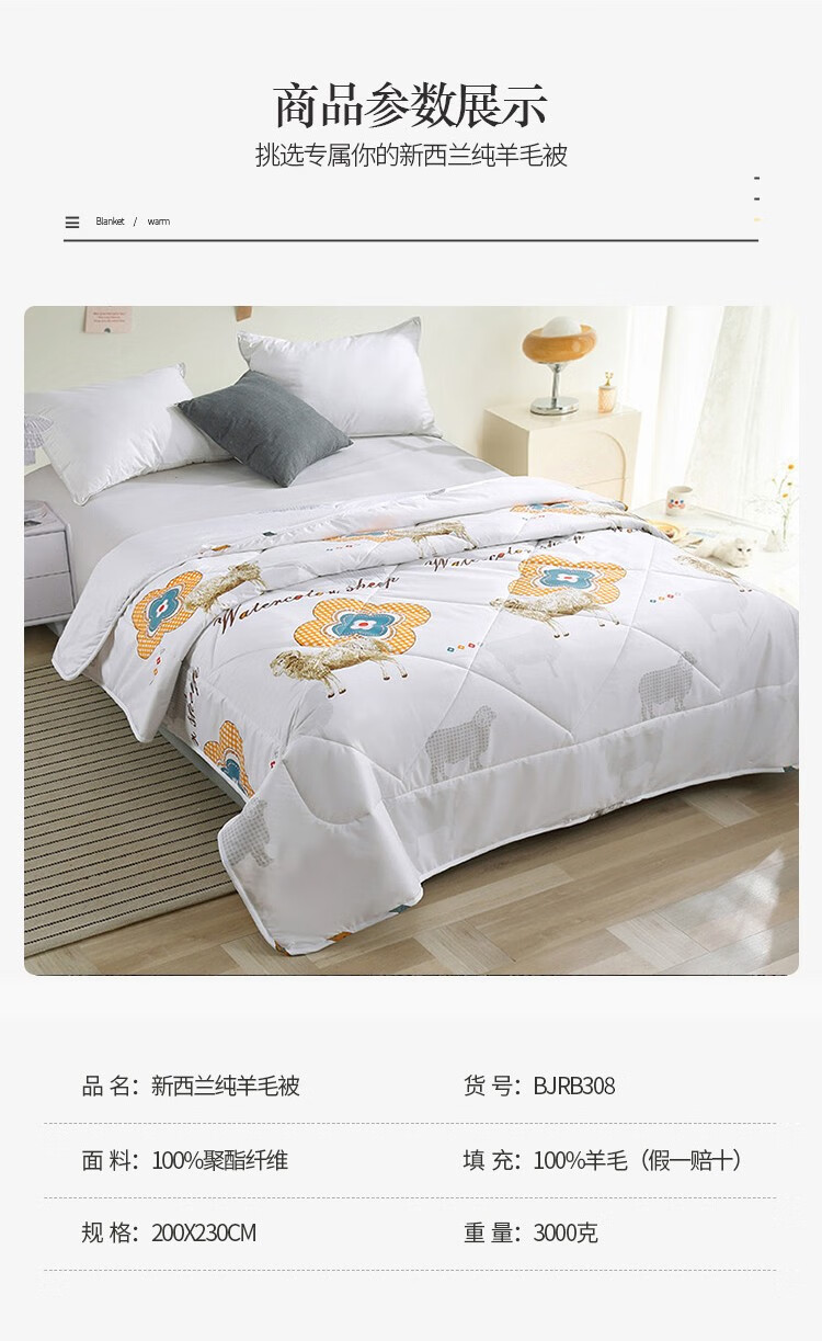 面 料:100 %聚酯纤维 填 充:100 %羊毛(假一赔十) 规 格:200x230cm 重 量:3000克 包 装:高 档皮革软包/礼盒 打 包 数:30条 /包