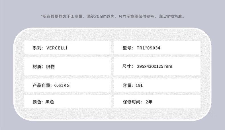主体面料:织物 产品颜色:黑色 产品尺寸:295×430×125mm 产品容量:19L 产品条码:5400520317001 装 箱数量:6pc