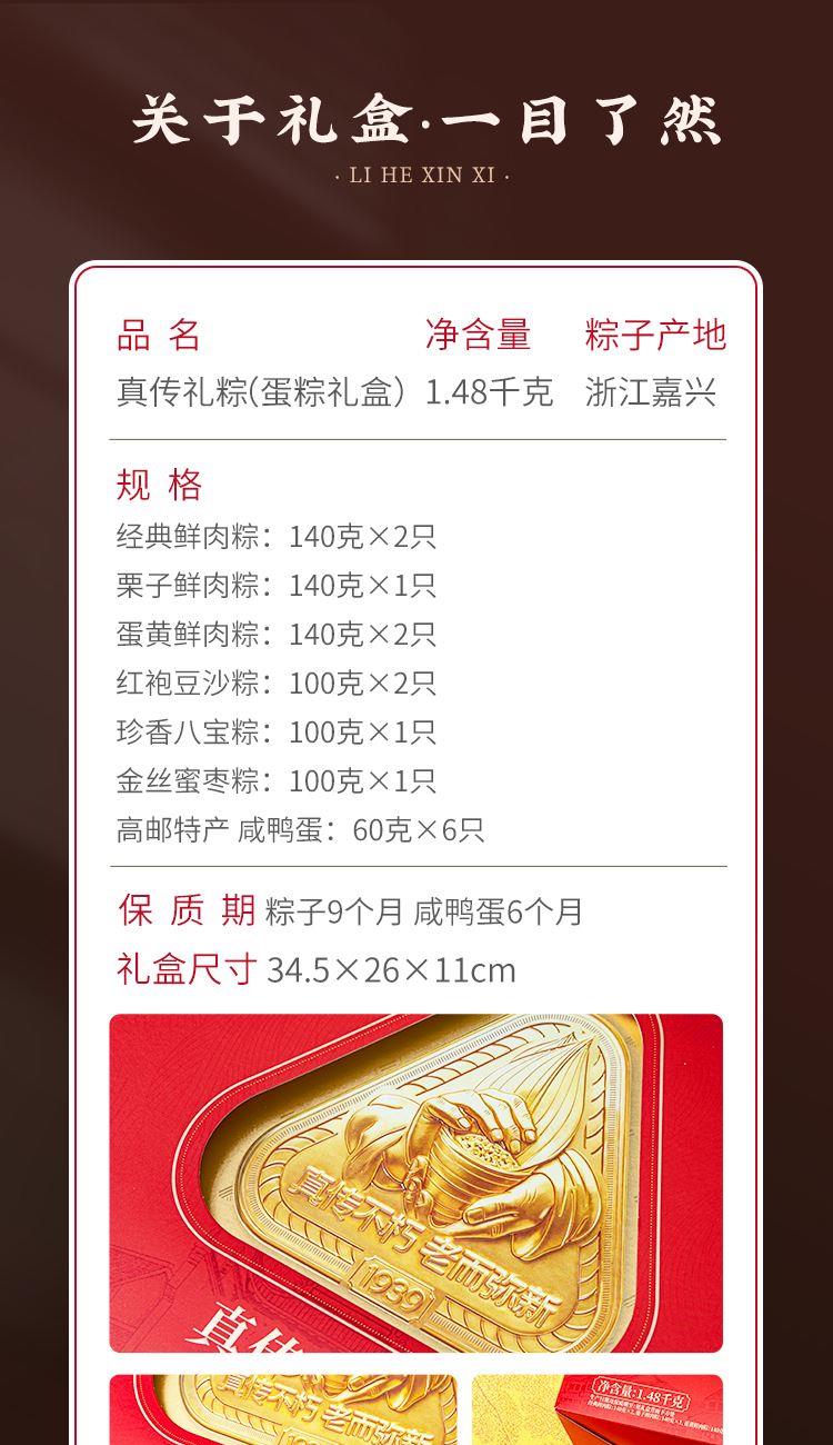 经典鲜肉粽:140克*1只/袋*2袋 栗子鲜肉粽:140克*1只/袋*1袋 蛋黄鲜肉粽:140克*1只/袋*1袋 红袍豆沙粽:140克*1只/袋*2袋 金丝蜜枣粽:140克*1只/袋*1袋 珍香八宝粽:140克*1只/袋*1袋 高邮特产咸鸭蛋:60克/只*6只/盒