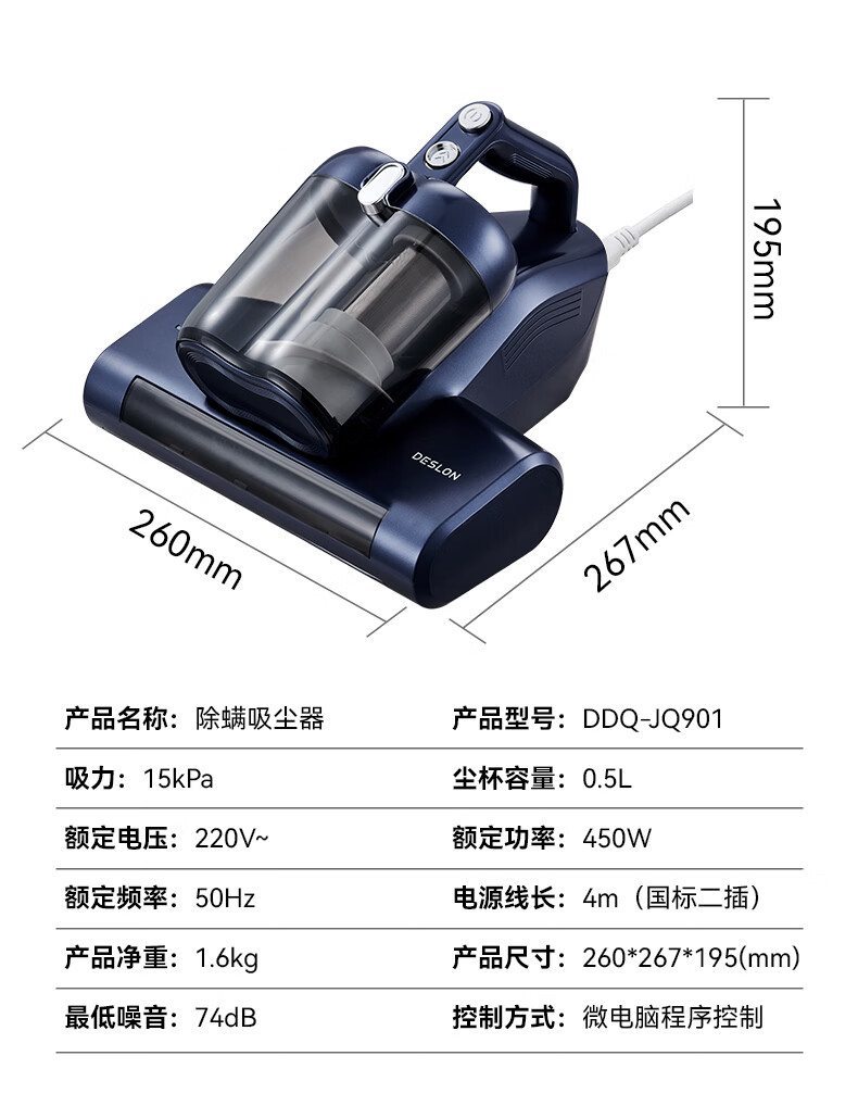 额定电压:220V ~ 额定频率:50Hz 额定功率:450W 吸 力:15kPa 尘杯容量:0.5L 控制方式:微电脑程序控制 主要材质:ABS+PC 产品尺寸:260*267*195mm 彩盒尺寸:325*295*215mm 产品净重:1.6kg 产品条码:6952020908559 装 箱 数:1台/箱(彩盒+邮购箱)