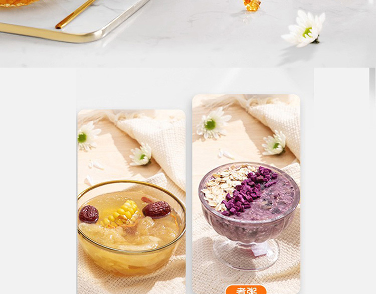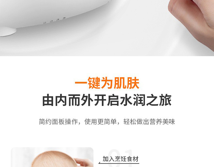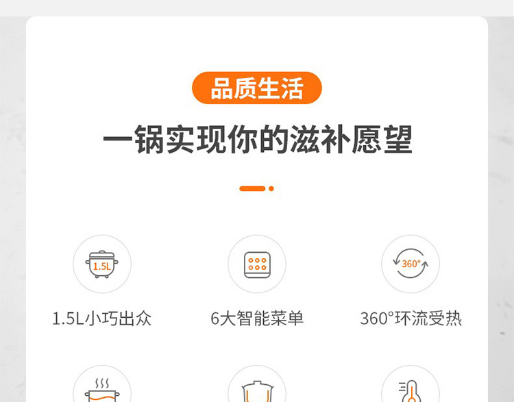 1、1.5L小巧出众 2、6大智能菜单 3、360°环流受热 4、静音防溢,优选白瓷 5、预约保温 容 量:1.5L 2.5KG 功 率:175W 装 箱数 量:1台 /箱