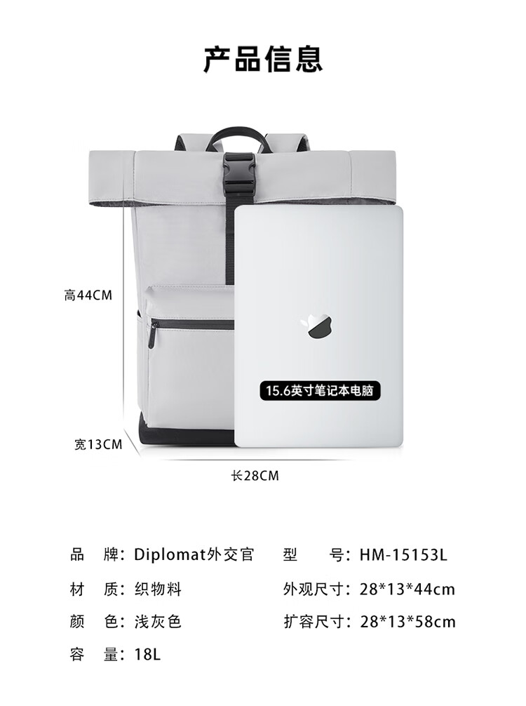 产品材质:织物料 产品颜色:浅灰色 外观尺寸:280*130*440mm (折叠前:280*130*580mm ) 产品容量:18L 产品条码:6958698326275 装 箱数量:10pc