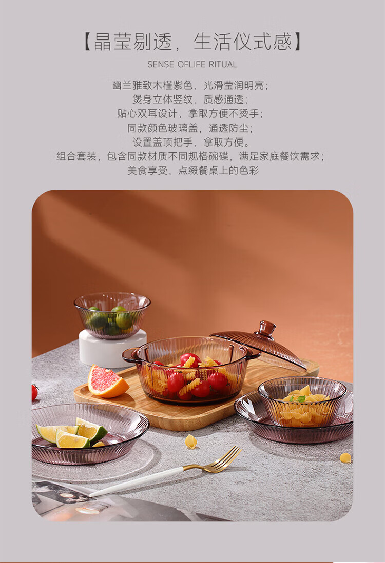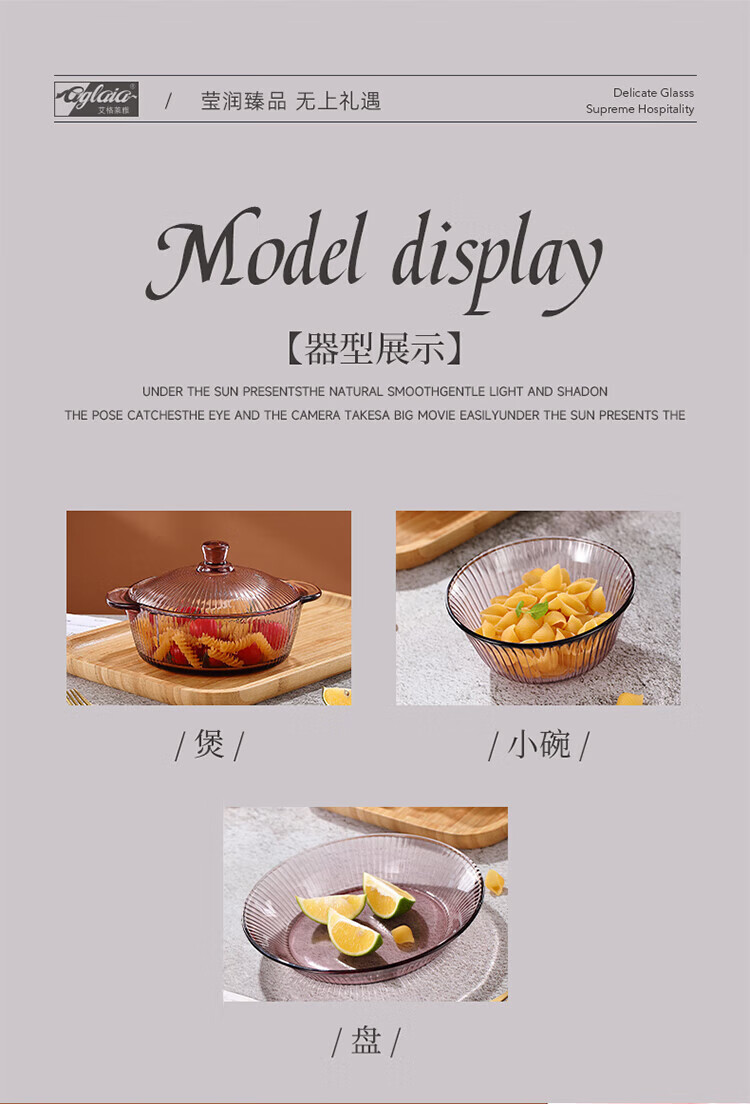 货 号:A-EB2007P/L3 材 质:色料玻璃(薰衣紫) 规 格:12套 /箱+毛重:17kg 组 合:煲*1,碗*2 尺 寸:煲口径:167mm,碗口径:125 容 量:煲:900ml;碗:260ml 外箱尺寸:52.2*32.2*38.2cm