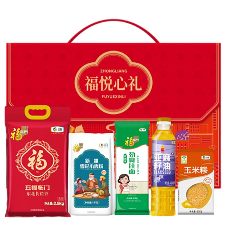 净含量:4350g+400ml 内 配: 中粮福临门五福临门长粒香米2.5kg 中粮福临门新疆雪花小麦粉1kg 中粮亚麻籽油400ml 中粮福临门妙惠家挂面500g 中粮金盈玉米糁350g