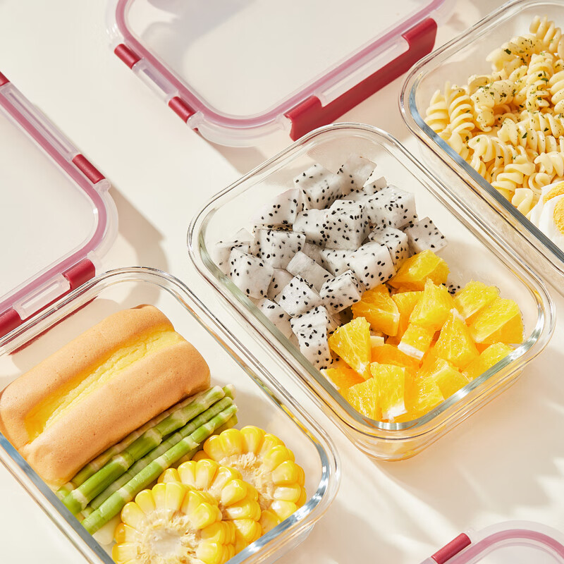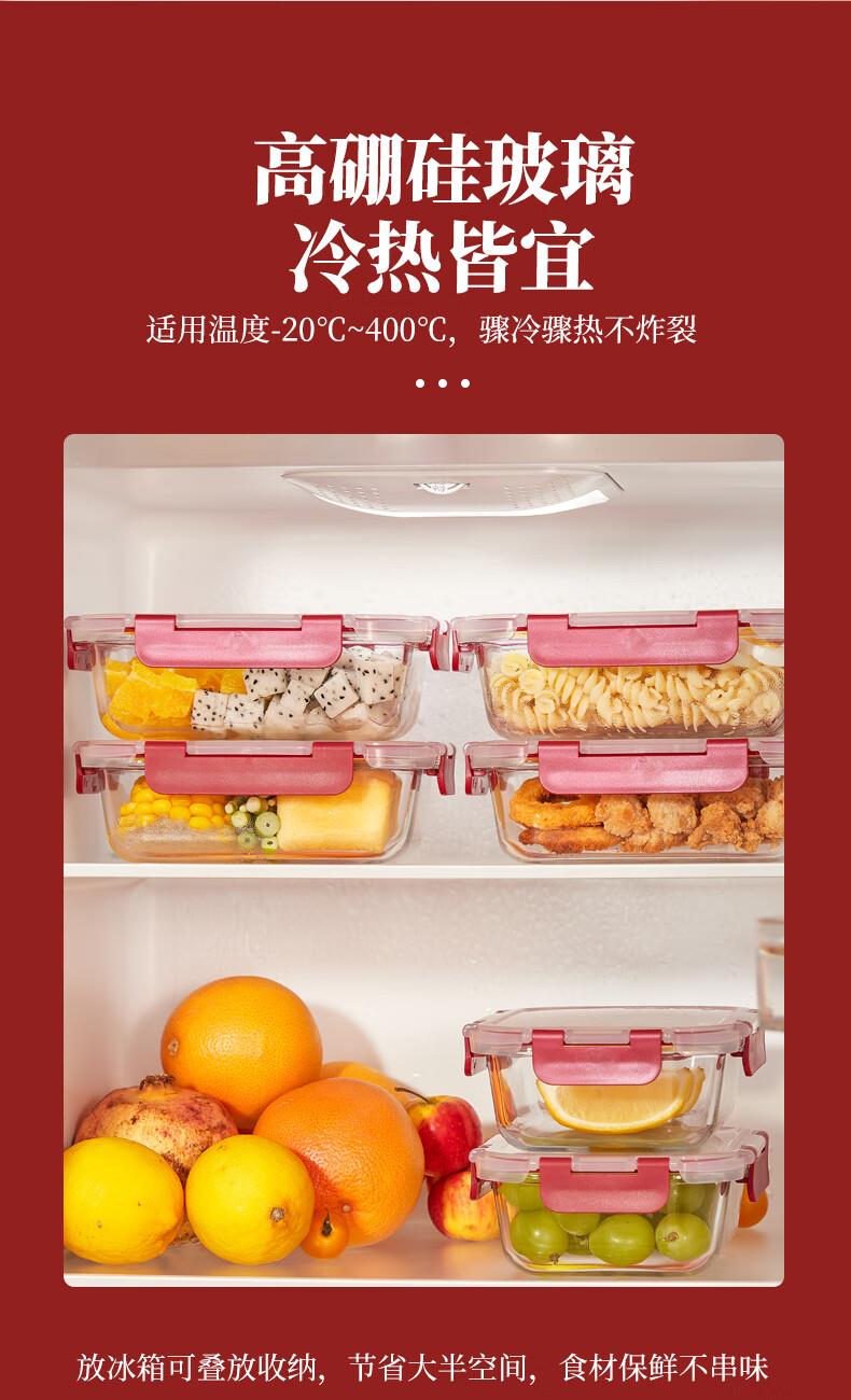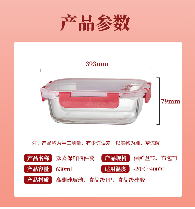【规格】:8套 /箱 【组合】中长保鲜盒630ml*3、布包*1 【材质】:高硼硅玻璃-20~400℃、食品级PP、食品级硅胶 【彩盒尺寸】:411*355*83mm 【外箱尺寸】:69.2*42.5*37.1CM 【毛重】:18.5kg