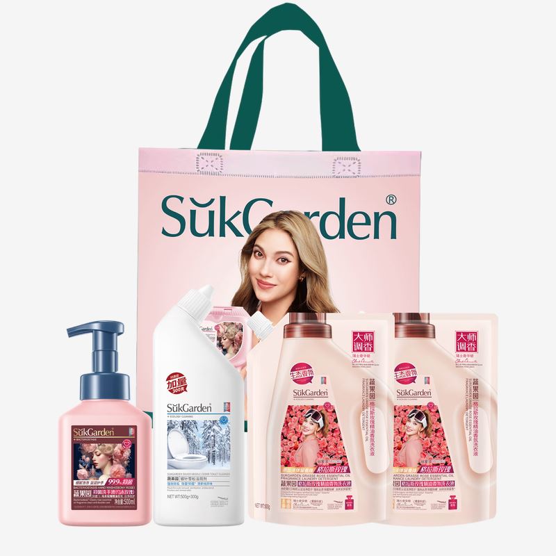 SukGarden蔬果园银针雪松洁厕剂*800g*1 SukGarden®抑 菌洗手液(乌木玫瑰)-500ml*1 SukGarden蔬果园格拉斯玫瑰精油香氛洗衣液(袋装)*500g*2