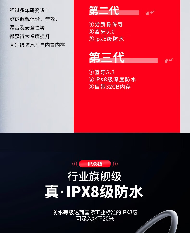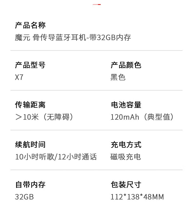 型号:X7 颜色:黑色(白/橙色1000起订) 蓝牙版本:5.3 传输距离:≤10米(无障碍) 电池容量:200mAh(典型值) 续航时间:10小时听歌/12小时通话 充电方式: 磁吸充电 防水等级: IPX8 包装尺寸:168*103*36mm 单个重量:160g 装 箱数量:60个 /箱 外箱尺寸:510*290*350mm