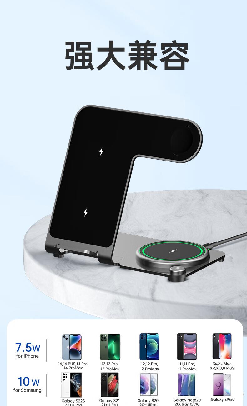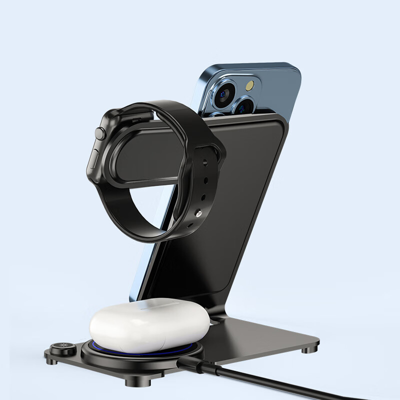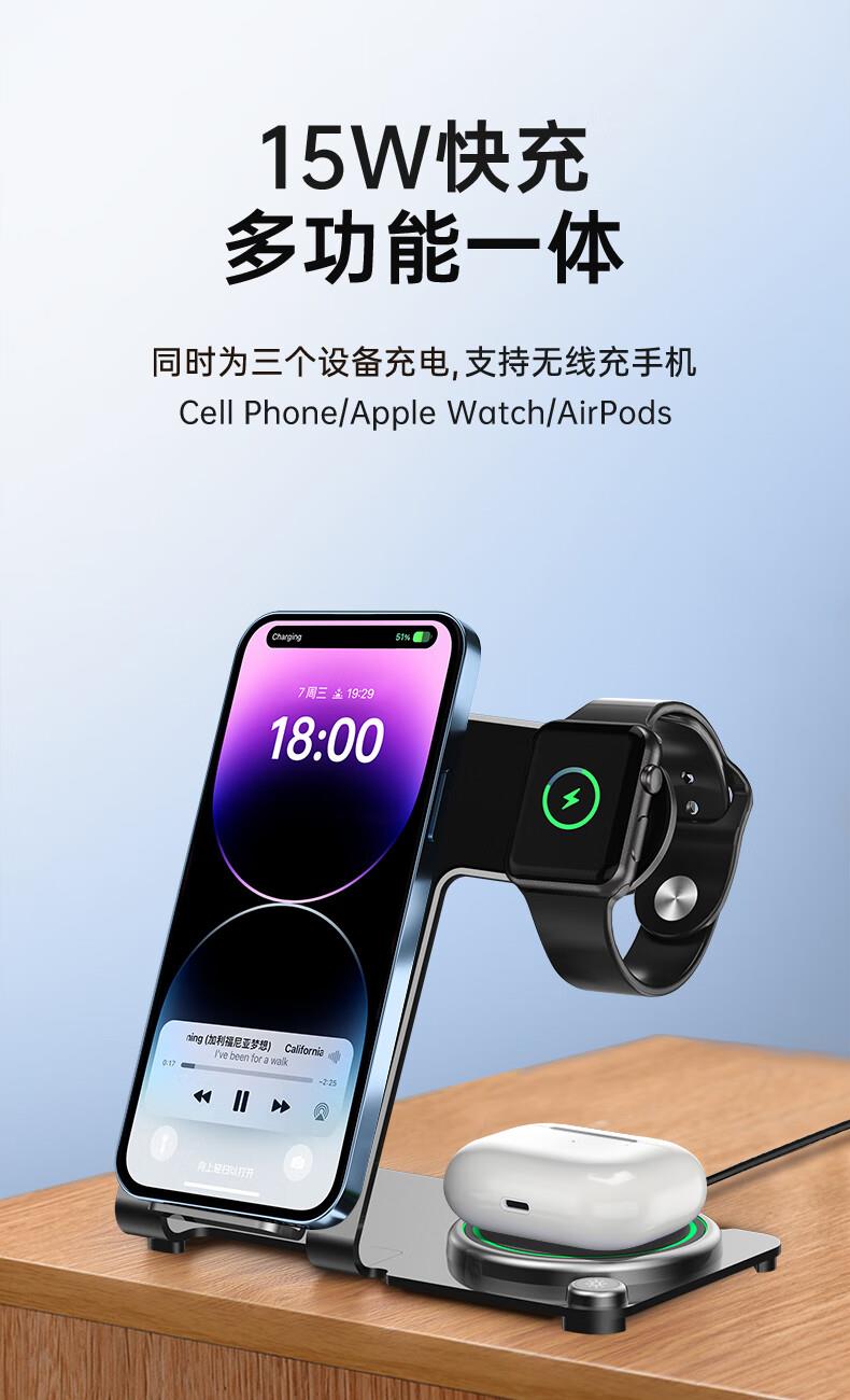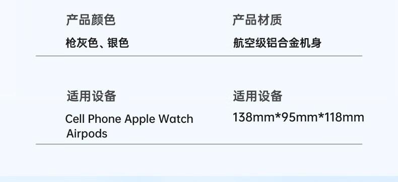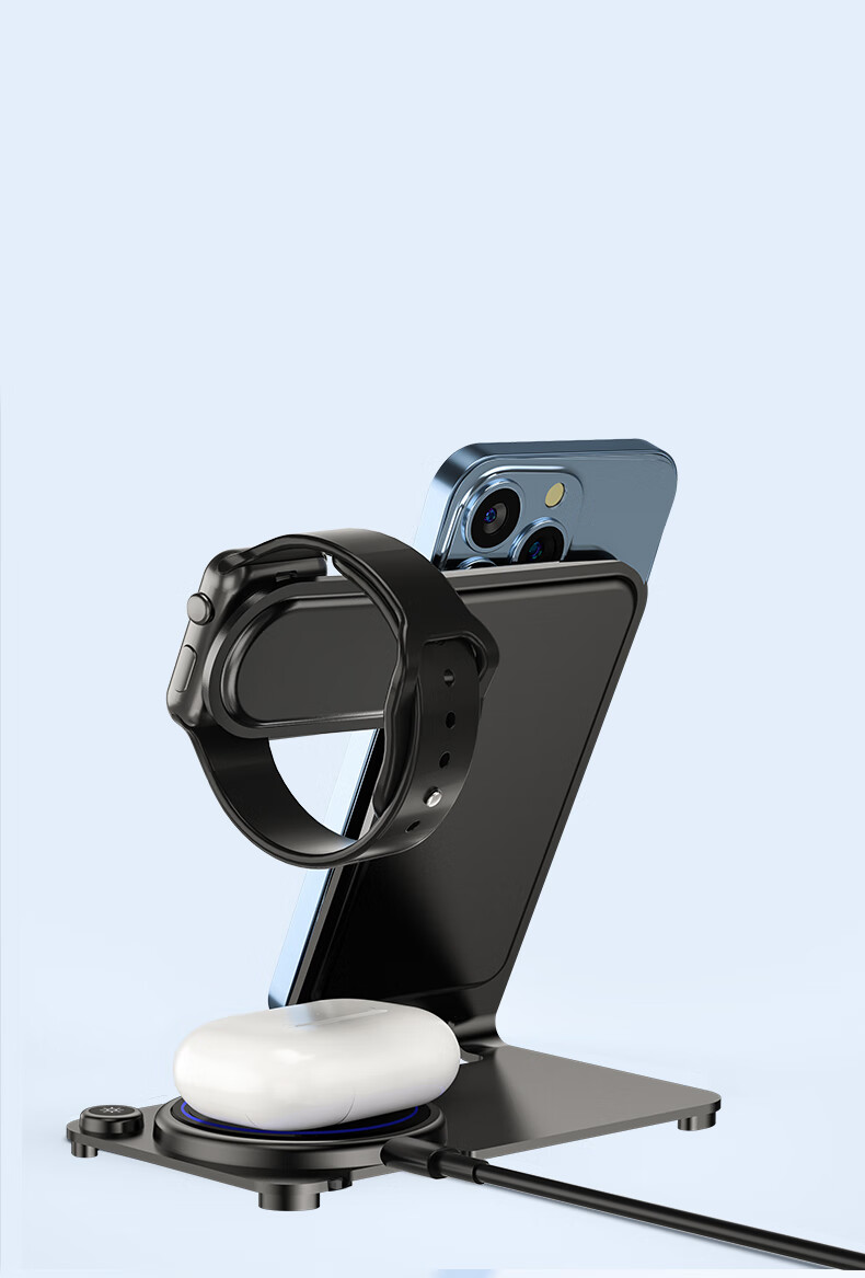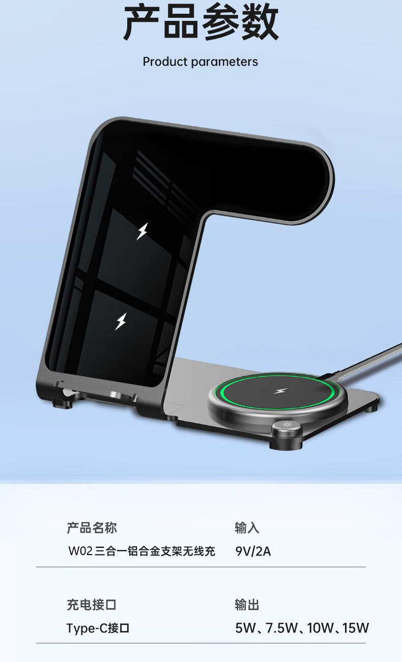 型号:W02 颜色:黑灰色(银/蓝/粉色1000起订) 材质:铝合金+亚克力 手机充电功率:5W/7.5W/10W/15W 耳机充电功率:3W 手表充电功率:2W(仅支持苹果) 产品尺寸:138*95*118mm 包装尺寸:110*150*130mm 产品重量:270g