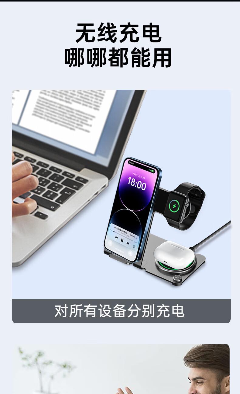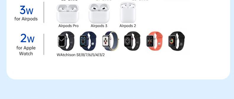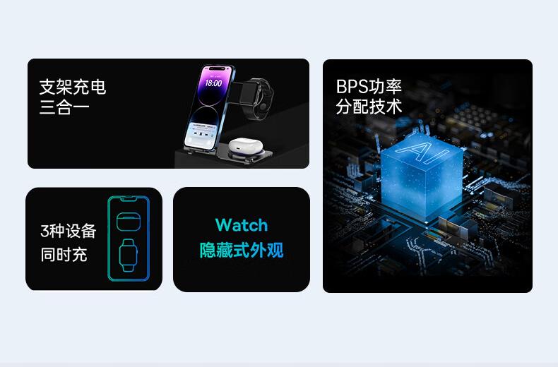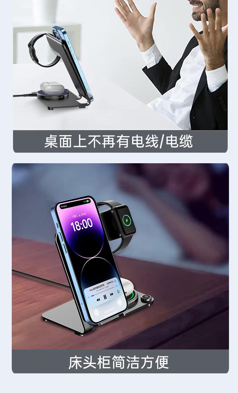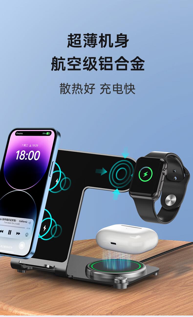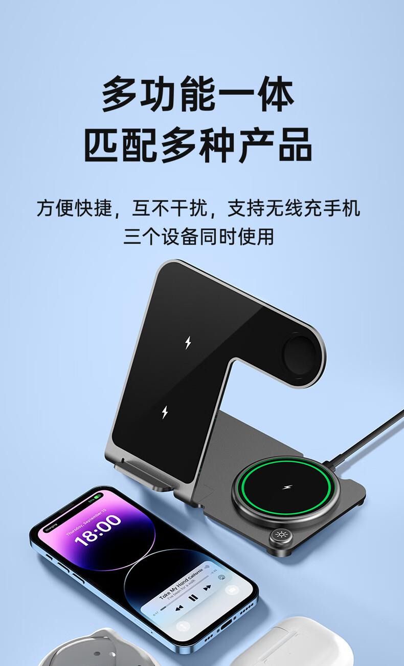 型号:W02 颜色:黑灰色(银/蓝/粉色1000起订) 材质:铝合金+亚克力 手机充电功率:5W/7.5W/10W/15W 耳机充电功率:3W 手表充电功率:2W(仅支持苹果) 产品尺寸:138*95*118mm 包装尺寸:110*150*130mm 产品重量:270g