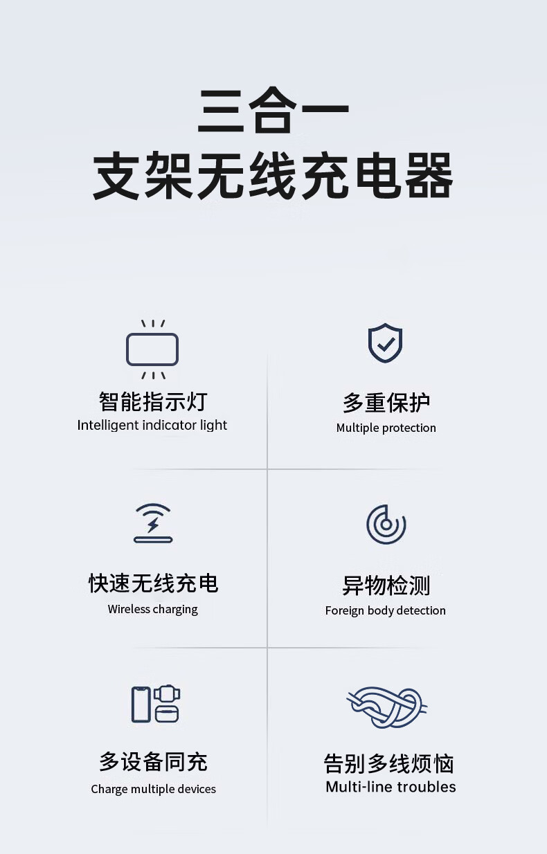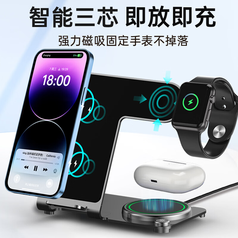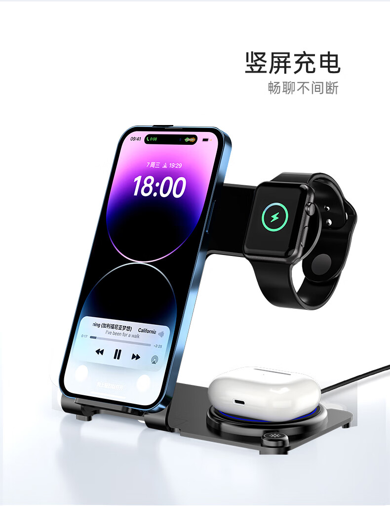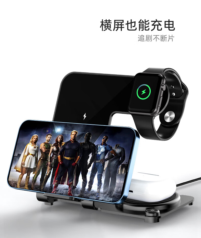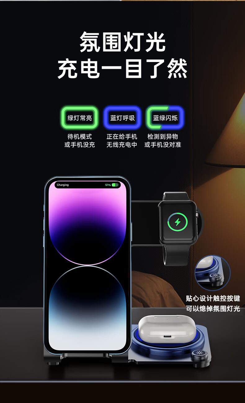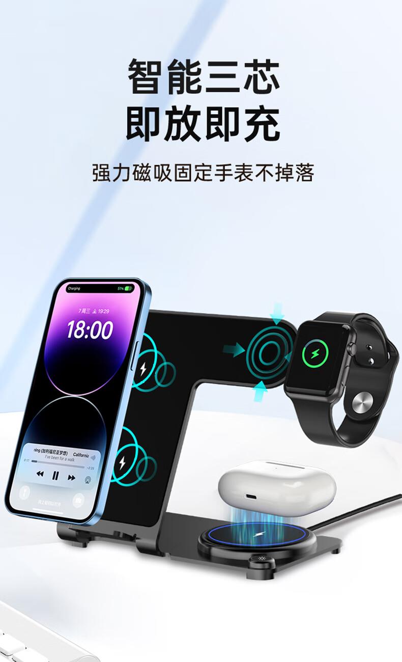型号:W02 颜色:黑灰色(银/蓝/粉色1000起订) 材质:铝合金+亚克力 手机充电功率:5W/7.5W/10W/15W 耳机充电功率:3W 手表充电功率:2W(仅支持苹果) 产品尺寸:138*95*118mm 包装尺寸:110*150*130mm 产品重量:270g