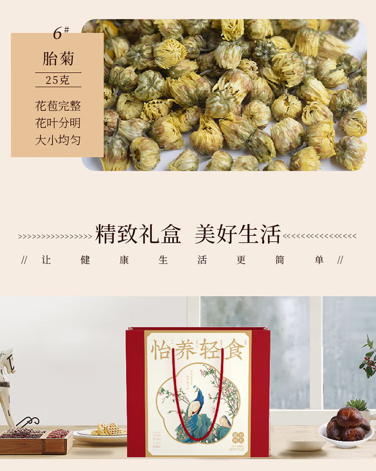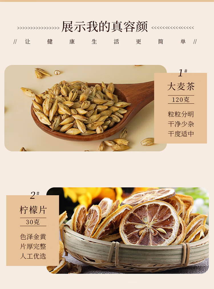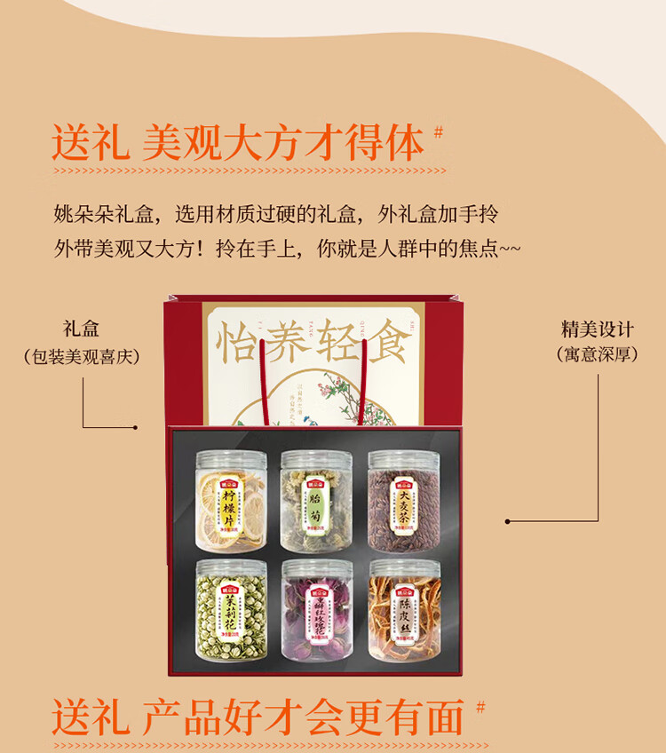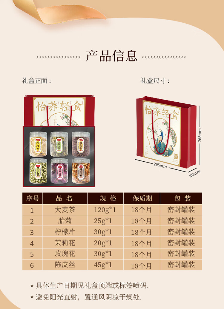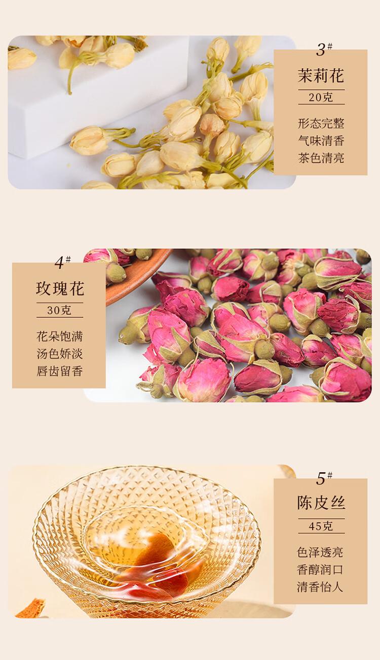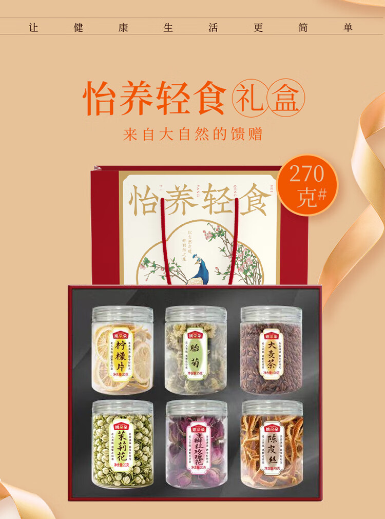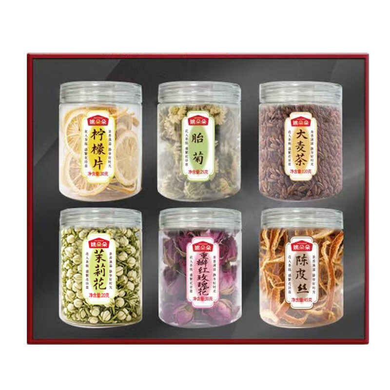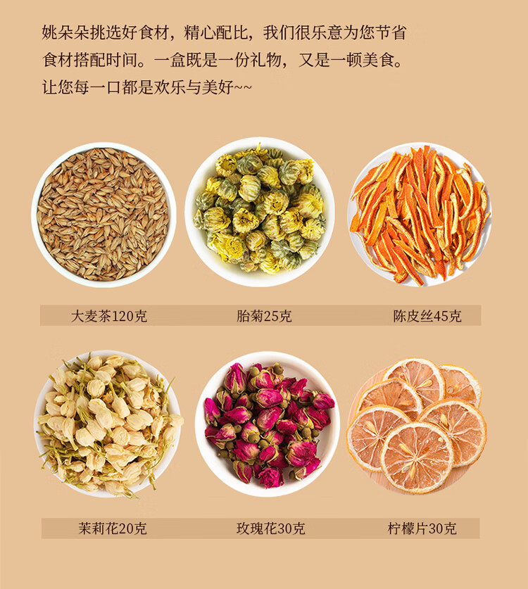 大麦茶120克 胎菊25克 柠檬片30克 茉莉花20克 陈皮丝45克 重瓣玫瑰花30克 包装盒-怡养轻食