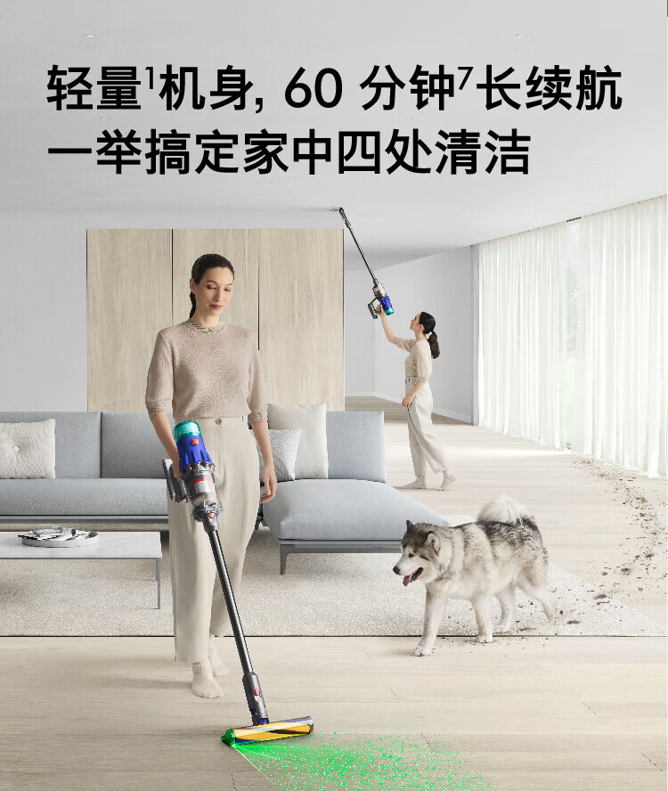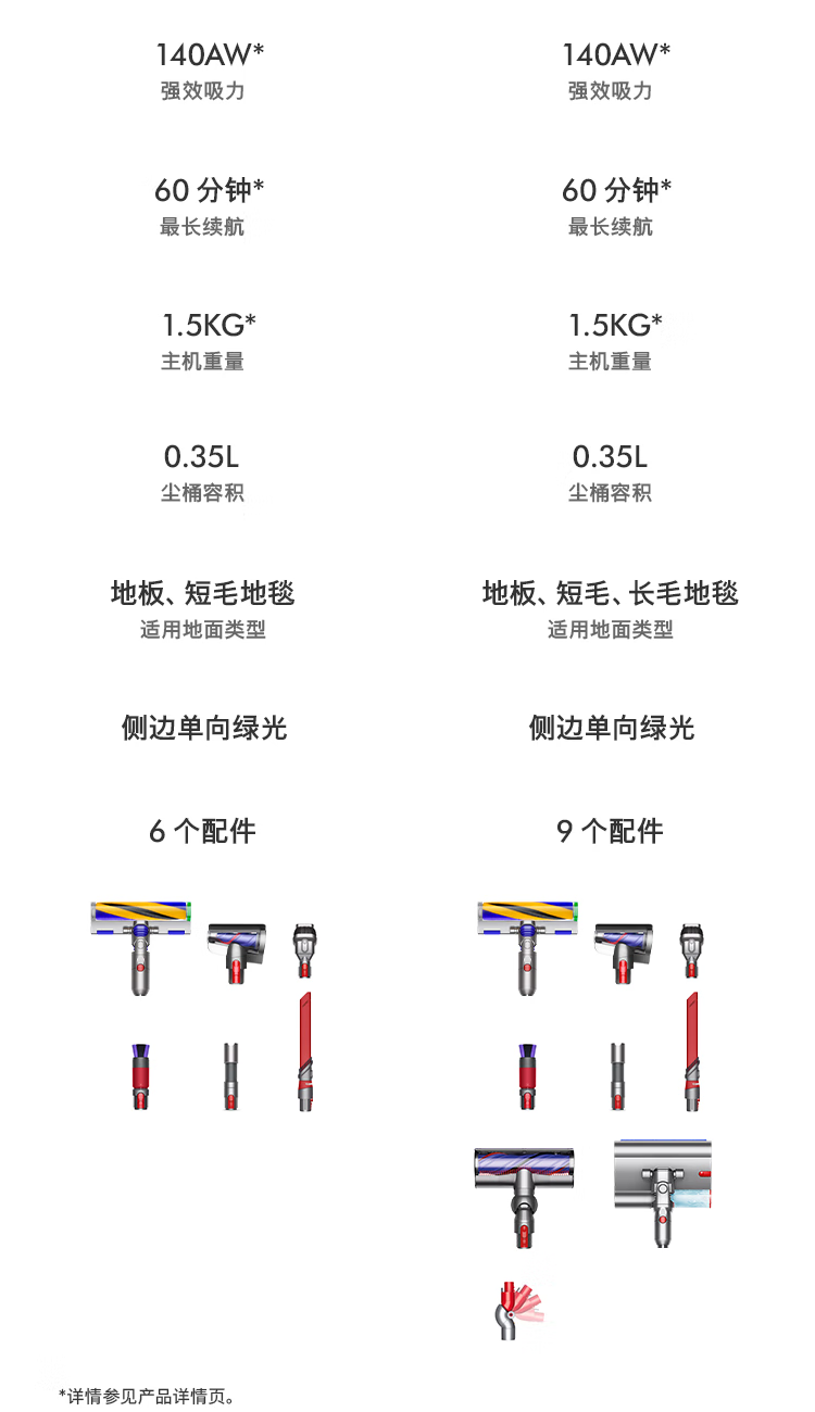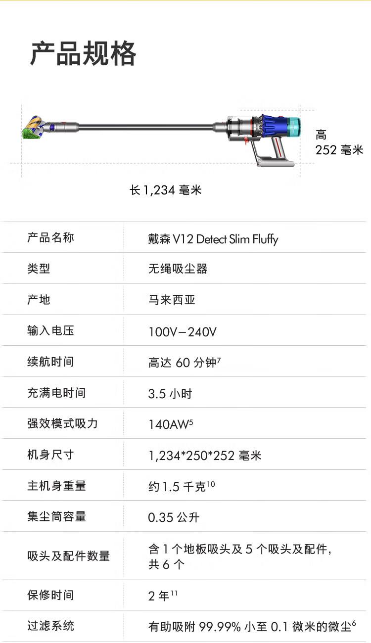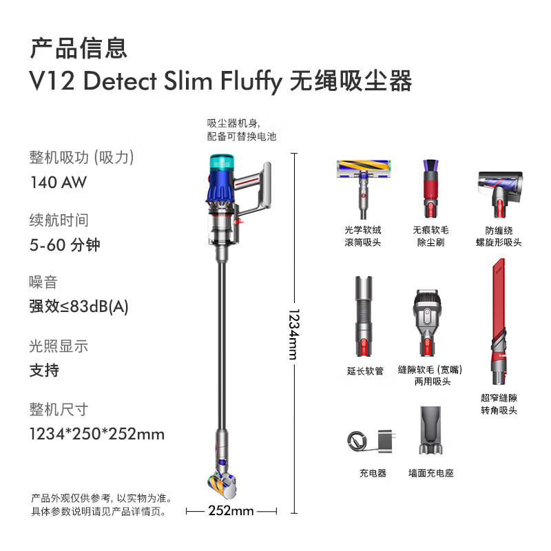型号:V12 detect slim NAUTIK 24款 v12 detect slim fluf特色功能:毛发防缠绕,电池可拆 吸头数量:6-8个吸力:121-150AW续航时间:45-60分钟