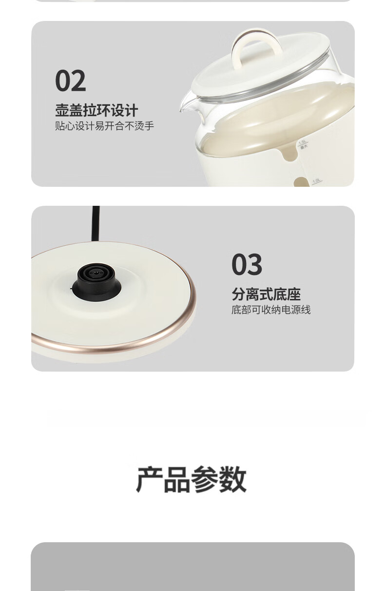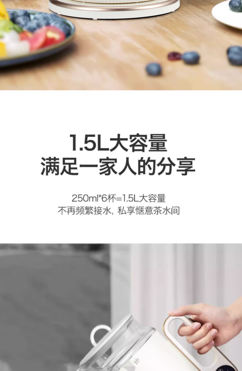 额定功率:800W 额定电源:220V~50Hz 额定容量:1.5L 产品净重:1.3kg 产品材质:高硼硅玻璃、PP、304 条形码:6971679081215 装 箱数:1*6 产品尺寸:205*156*257mm 彩箱尺寸:230*200*270mm 外箱尺寸:645*495*305mm 装 箱清单:主机*1、说明书*1