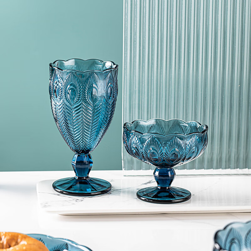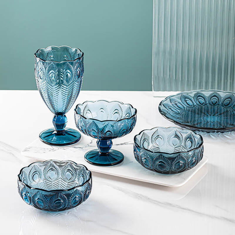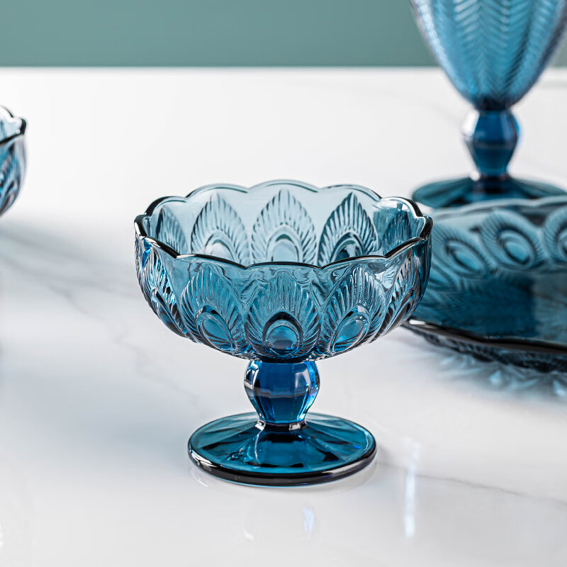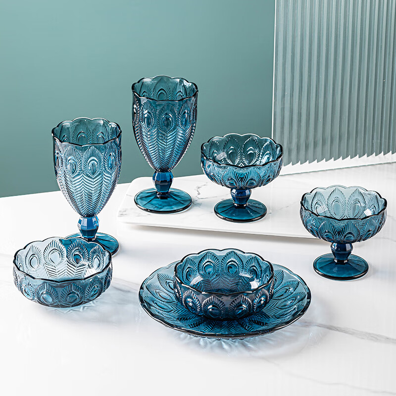 产品材质:钠钙玻璃 产品参数:冰淇淋杯220ml*2/高脚杯330ml*2/小碗280ml*2/盘子195mm*1 颜 色:墨蓝色 装 箱毛重:8套 /箱,19kg 彩盒尺寸:33.8*13.2*24.6cm 外箱体积:54.5*35.2*51.5/cm