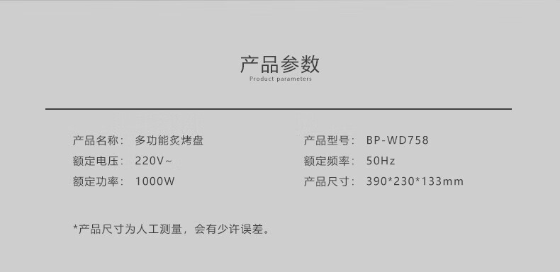 材质:压铸铝+水转印电木+金属外壳+陶瓷釉 额定电压/频率:220V~50Hz 额定功率:1000W 产品尺寸:390*230mm 产品重量:1.8kg 彩盒尺寸:470*105*245mm 装 箱数量:10台 外箱尺寸:540*480*500mm