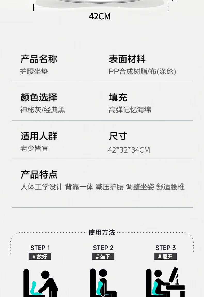 产品尺寸:34.5*42*30cm 彩盒尺寸:42.6*23.5*45.5CM 产品重量:1.05kg 颜色:灰色、黑色、粉、蓝、紫、绿 材质:PP、(聚酯纤维) 表面:高密度海绵 装 箱数量:20台 外箱尺寸:44×42×75CM