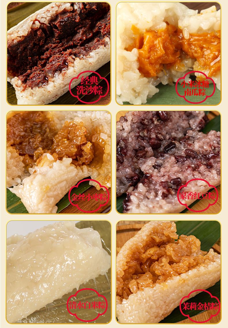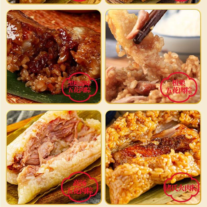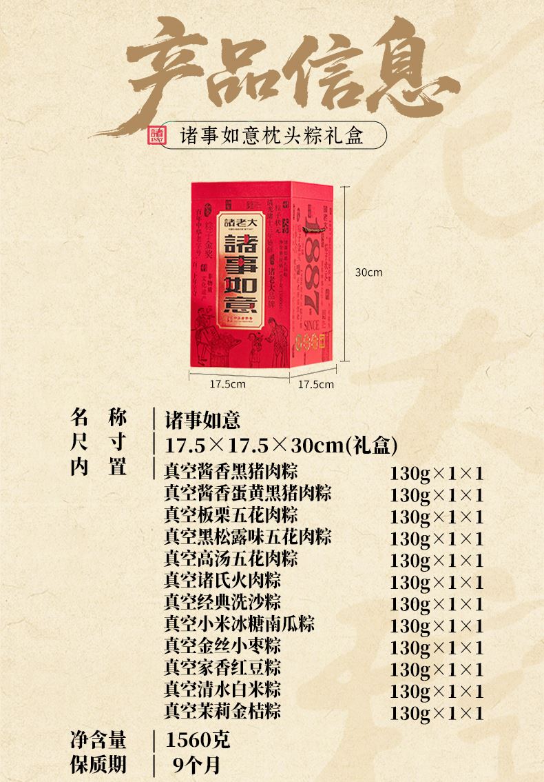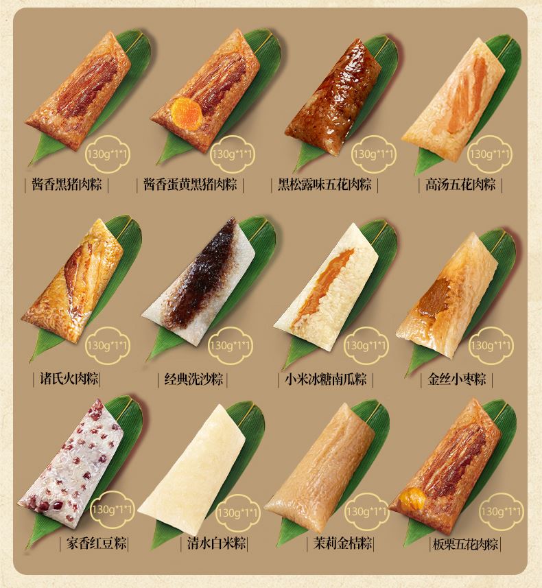 130克*1真空酱香黑猪肉粽 130克*1真空酱香蛋黄黑猪肉粽 130克*1真空板栗五花肉粽 130克*1真空黑松露味五花肉粽 130克*1真空高汤五花肉粽 130克*1真空诸氏火肉粽 130克*1真空经典洗沙粽 130克*1真空小米冰糖南瓜粽 130克*1真空金丝小枣粽 130克*1真空家香红豆粽 130克*1真空清水白米粽 130克*1真空茉莉金桔粽