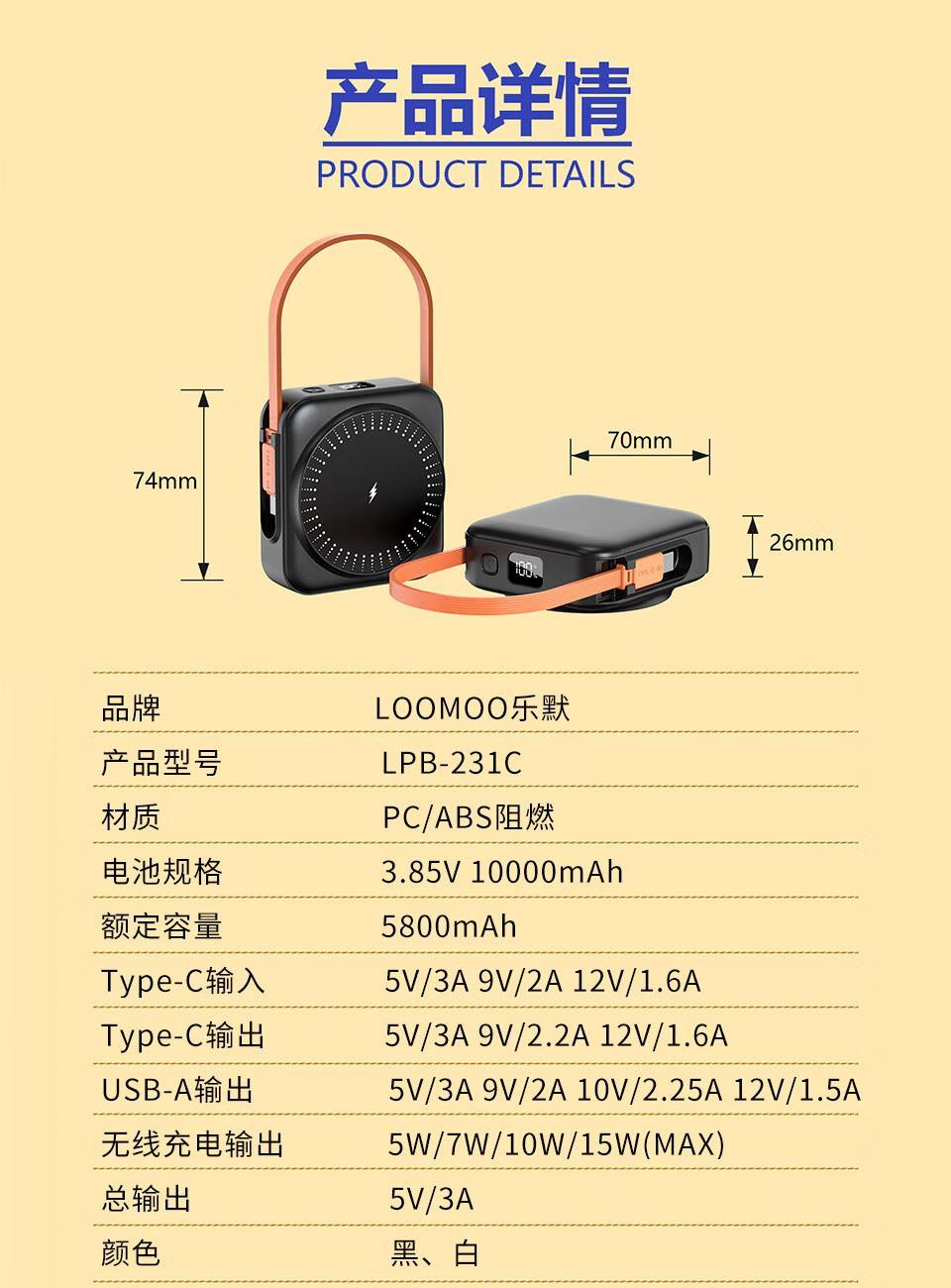 电池类型:锂离子聚合物电池 电池规格:10000毫安 额定容量:5800毫安