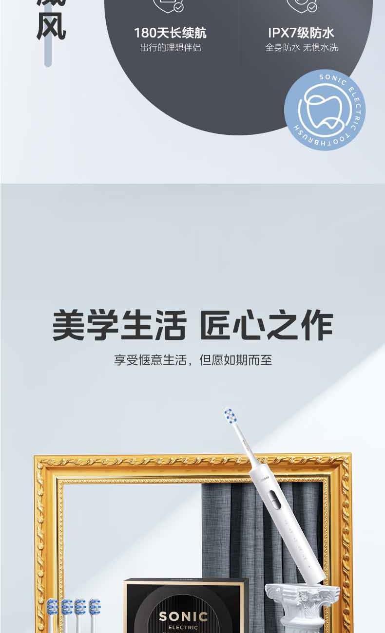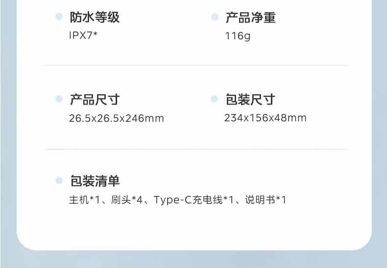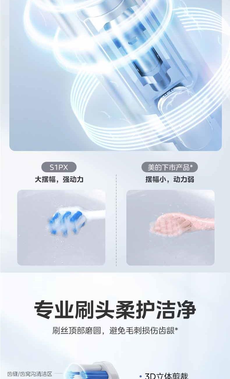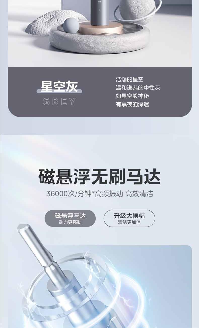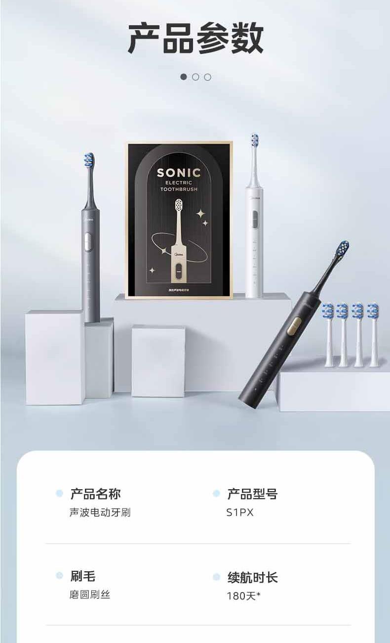 型 号 :S1PX 颜 色 :曜石黑/极地白/深空灰 充电时间 :4h 防水等级 :IPX7 续航时间 :180天 包装内含 :主机*1、刷头*4、说明书*1、Type-C充电线*1 卖点: ① 专业磁悬浮马达,5种清洁模式,振动频率高达36000次/分钟,高效清洁 ② 1200mAh大容量电池,180天长续航,出差旅行无忧 ③ 专业杜邦刷丝,高效清理齿间、齿缝残留污垢 ④ 科学刷牙计时,2分钟定时关机,30秒换区提醒