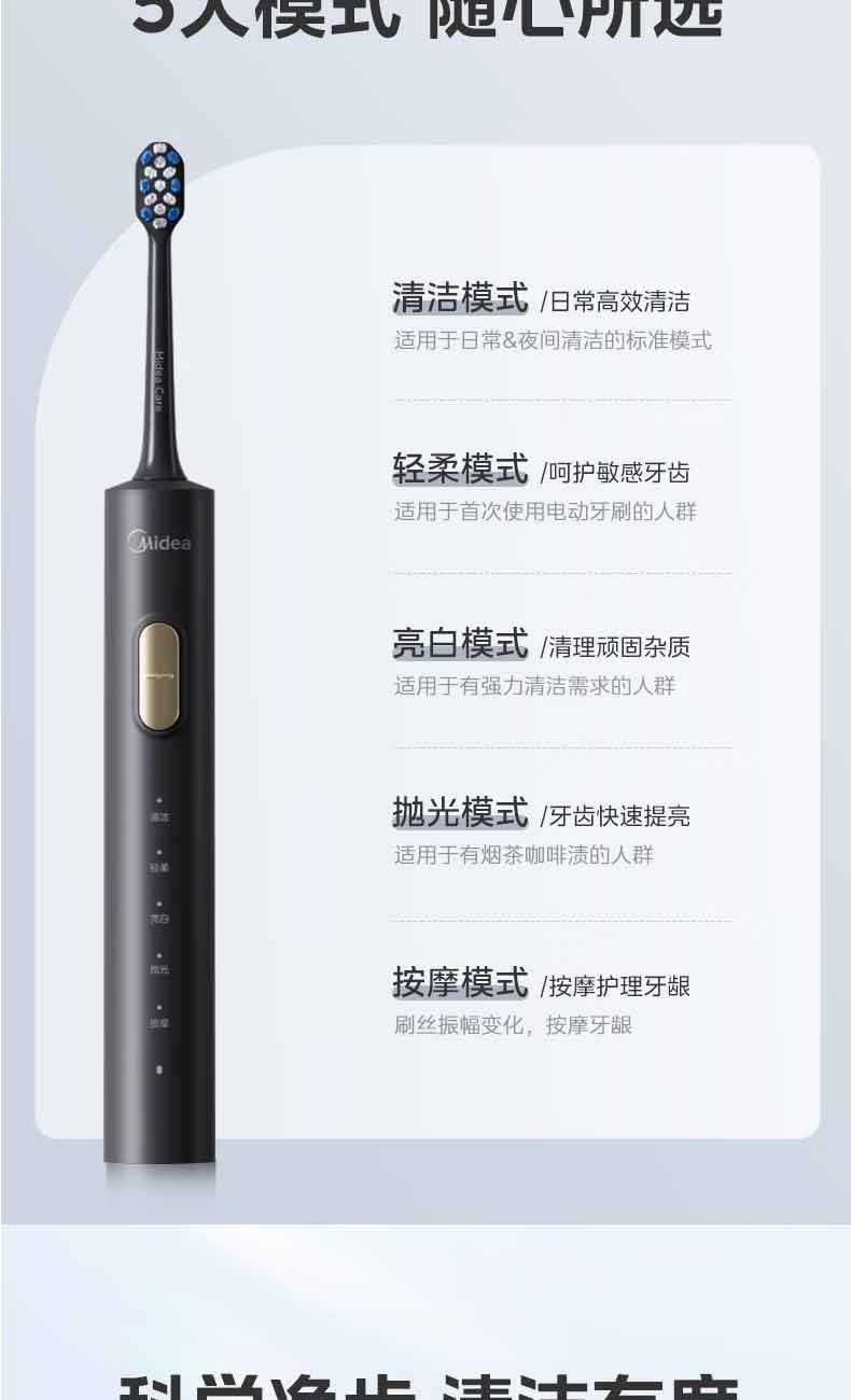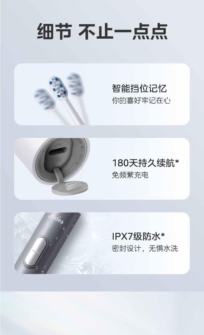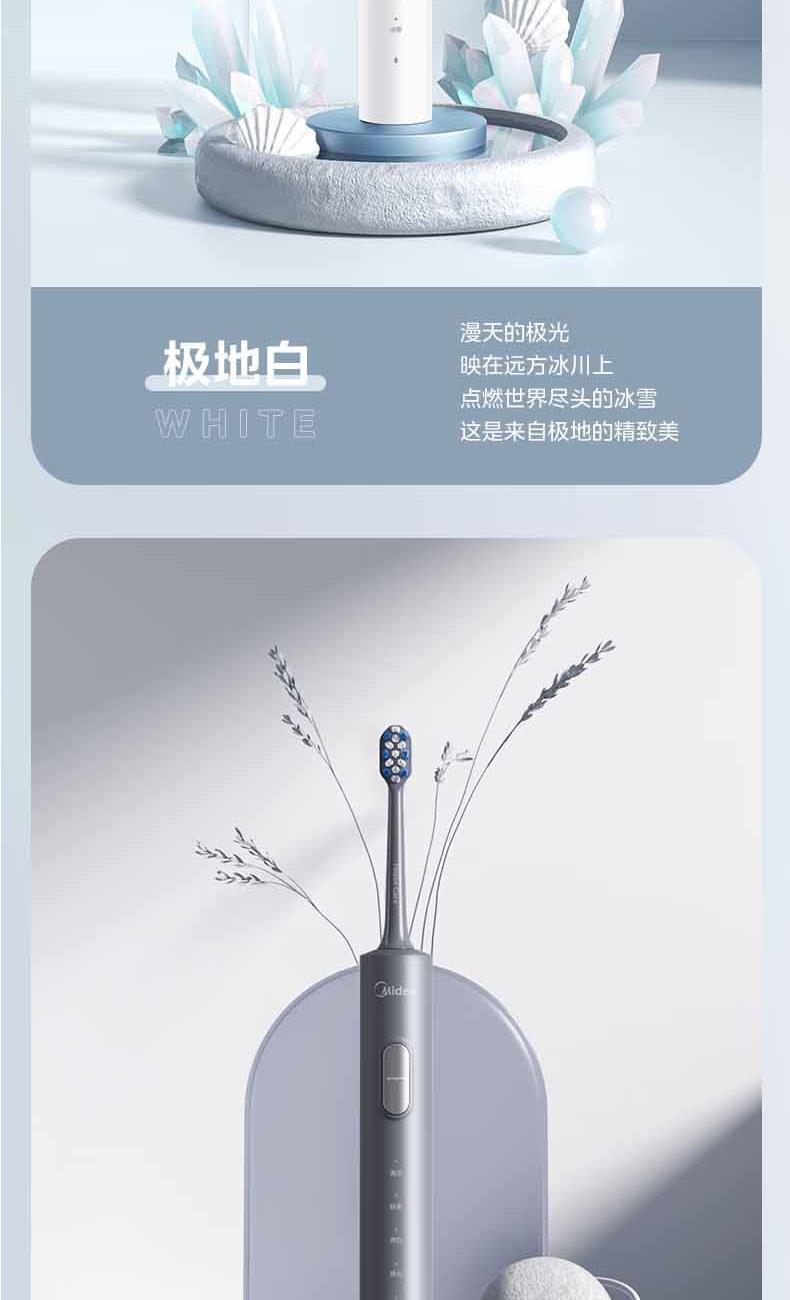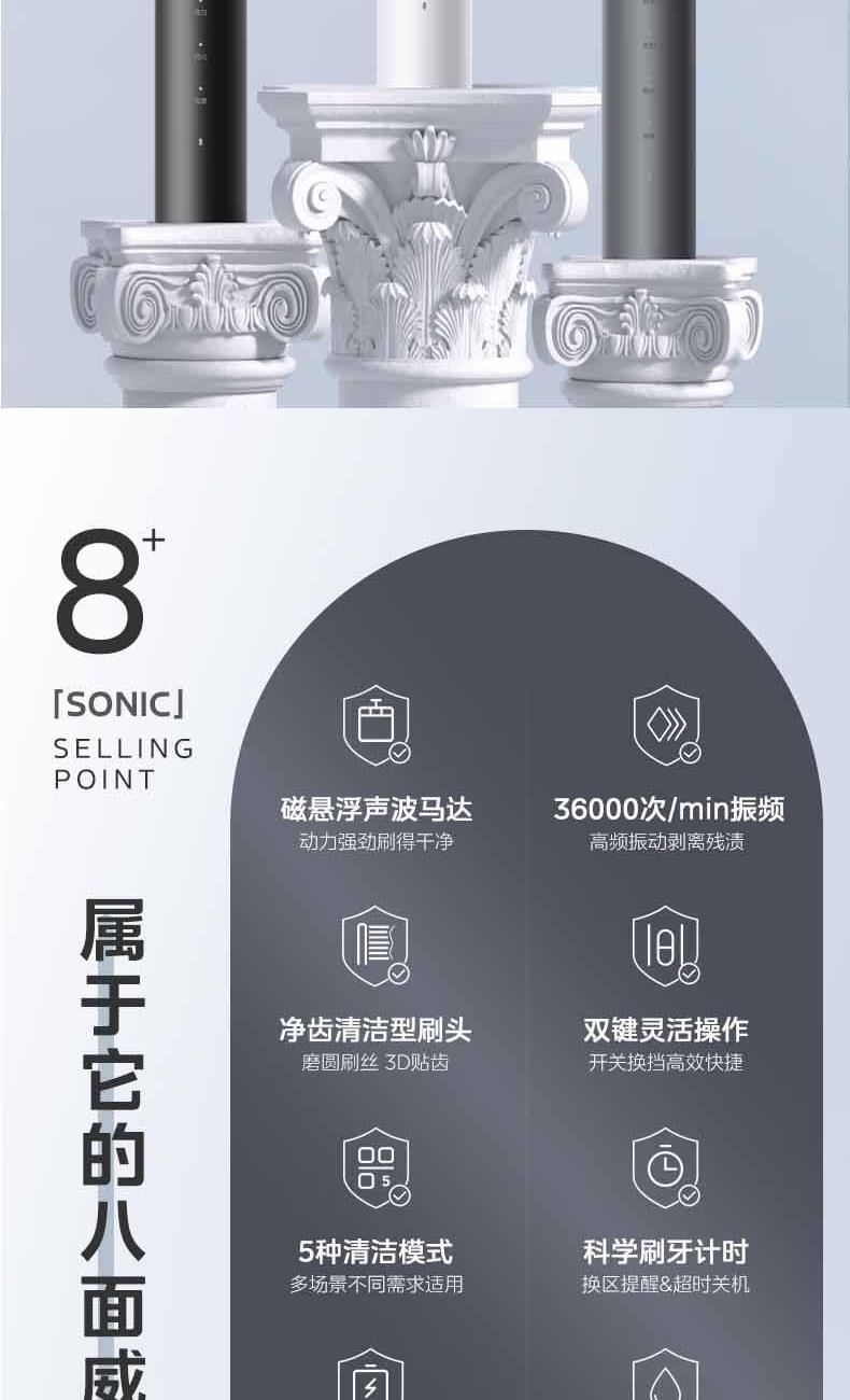 型 号 :S1PX 颜 色 :曜石黑/极地白/深空灰 充电时间 :4h 防水等级 :IPX7 续航时间 :180天 包装内含 :主机*1、刷头*4、说明书*1、Type-C充电线*1 卖点: ① 专业磁悬浮马达,5种清洁模式,振动频率高达36000次/分钟,高效清洁 ② 1200mAh大容量电池,180天长续航,出差旅行无忧 ③ 专业杜邦刷丝,高效清理齿间、齿缝残留污垢 ④ 科学刷牙计时,2分钟定时关机,30秒换区提醒