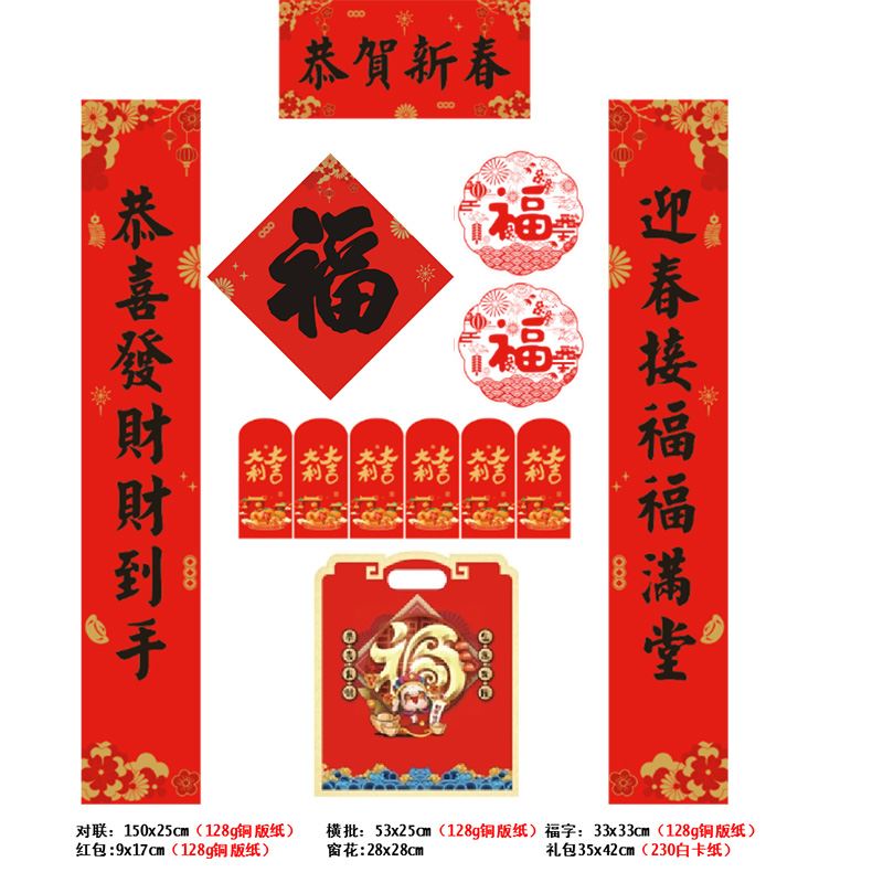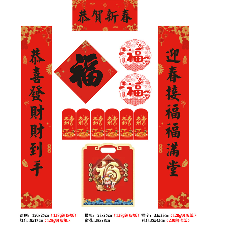 对联:150x25cm(128g铜版纸) 横批:53x25cm(128g铜版纸)福字:33x33cm(128g铜版纸) 红包:9x17cm(128g铜版纸) 窗花:28x28cm 礼包35x42cm(230白卡纸)