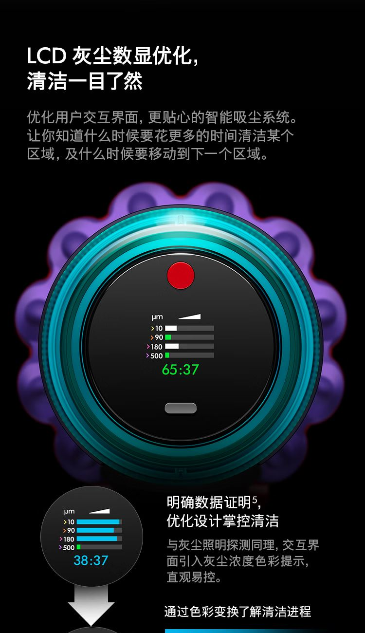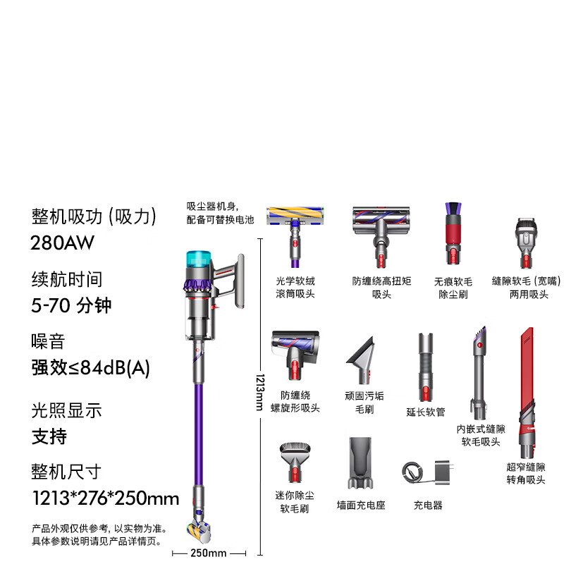 型号:G5detect absolute 机身尺寸:1213*276*250MM 机身重量:2.3KG 集尘筒容量:0.77L 地面运行时间:普通模式70分钟 强效模式20分钟 充满电时间:3.5小时 车载充电时间:4.25小时 吸头及配件数量:含含2个地板吸头及8个吸头及配件