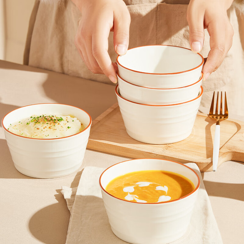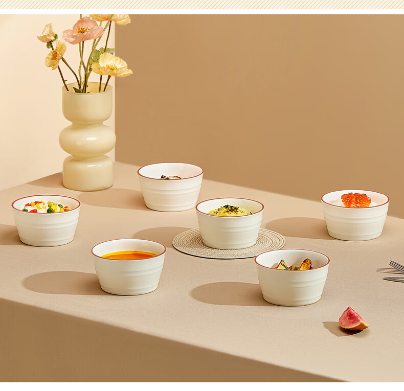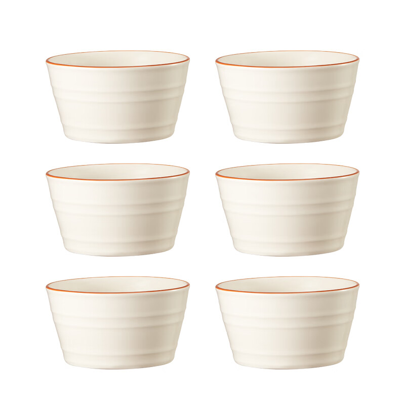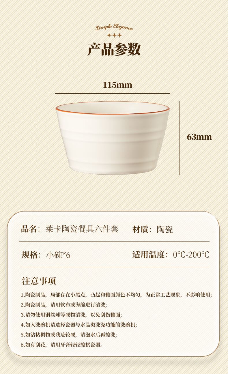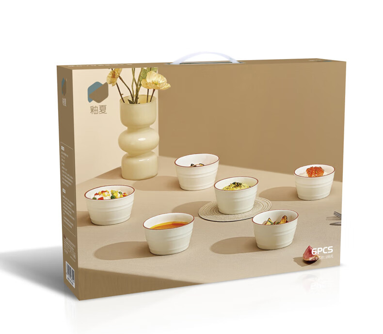 材 质:高温瓷装 箱 规格:12套 /箱产品参数:4.5英寸小碗*6彩盒尺寸:328*69*241mm 外箱尺寸:43.8*34.2*50cm