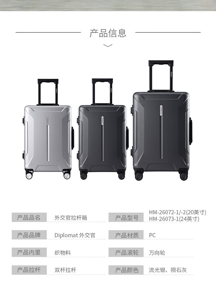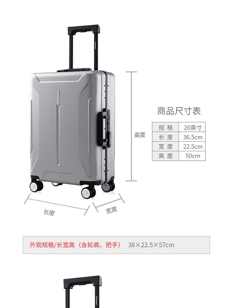 产品材质:PC 产品颜色:陨石灰(-1)/流光银(-2) 外观尺寸:380*225*570mm /20英寸