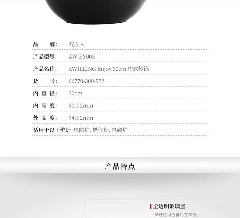 产品货号:1031846 产品材质:基材:铝合金3003,不粘镀层:威堡龙C3+ 产品参数:内直径:30cm,内高度:9.0±0.2cm, 外高度:9.4±0.2cm,锅身厚度:4.0mm 包装尺寸:彩盒 52.5×39×12.5cm 装 箱明细:4pcs/箱