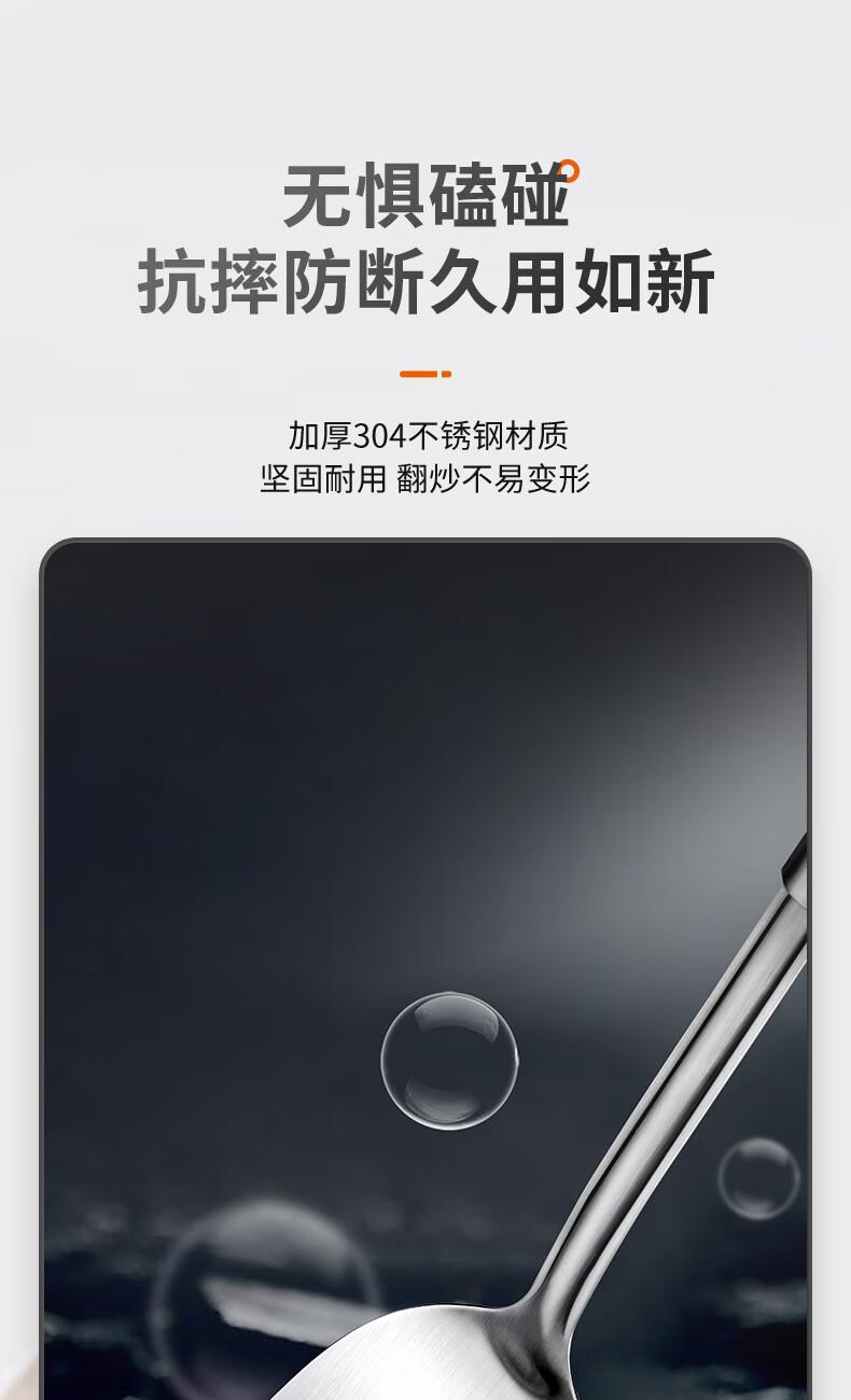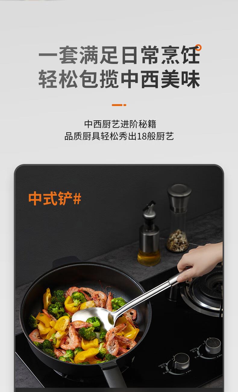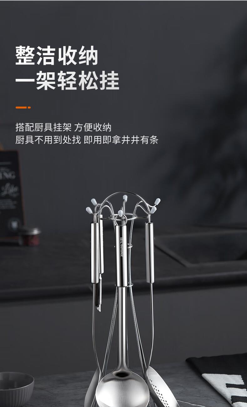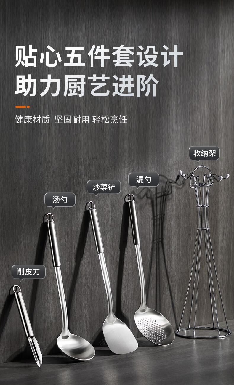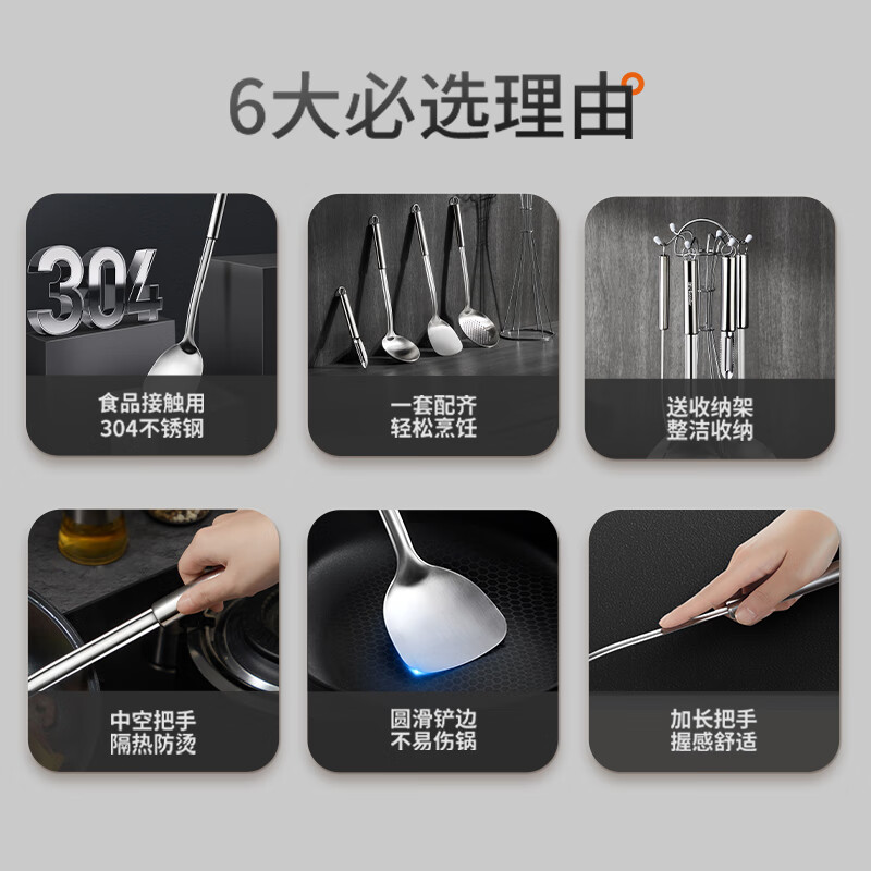 1、304优质不锈钢,耐久性不锈钢,健康材质,医 用 级 别抗 菌材质, 2、一套配齐,轻松烹饪 3、送收纳架,整洁收纳 4、中空把手,隔热防烫 5、圆滑铲边,不易伤锅 6、加长把手,握感舒适 7、环保包装,一件12台