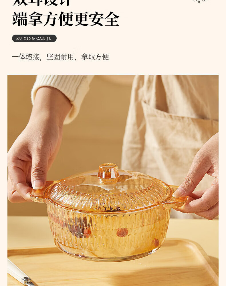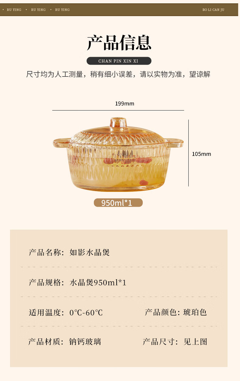 【规格】:16 套 /箱 【组合】:煲底+煲盖 950ml 【材质】:钠钙玻璃 0~60℃ 【彩盒尺寸】:181*100*164mm 【外箱尺寸】:42*38*35cm