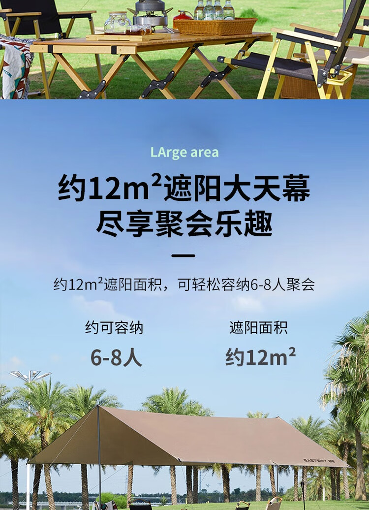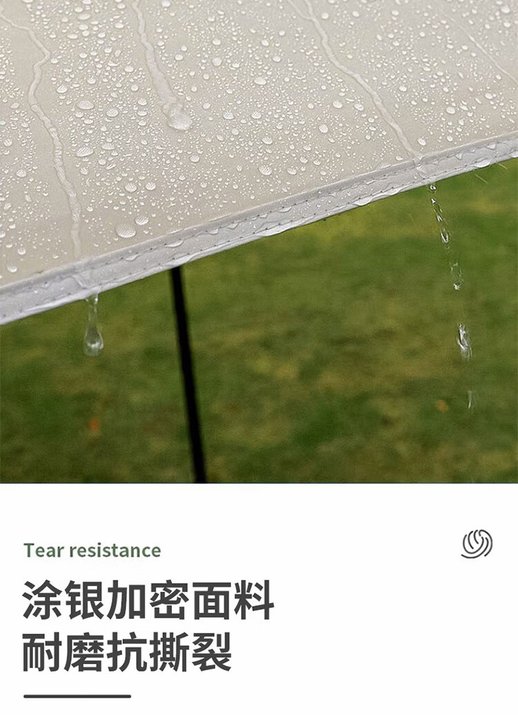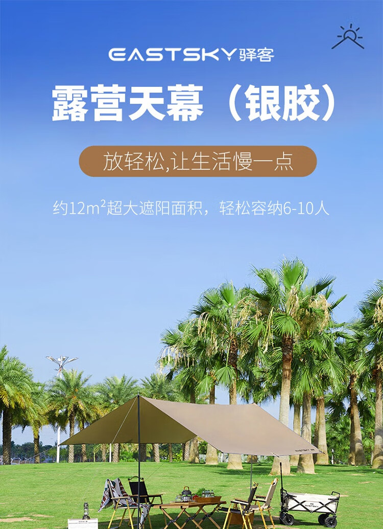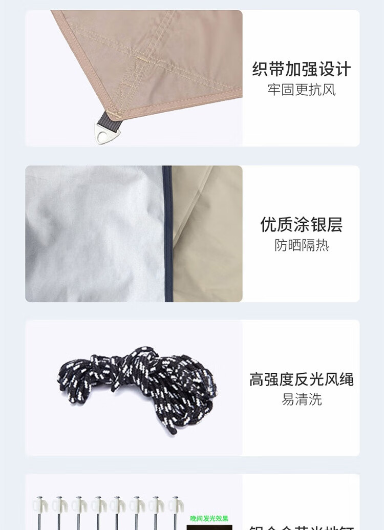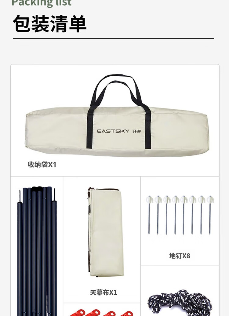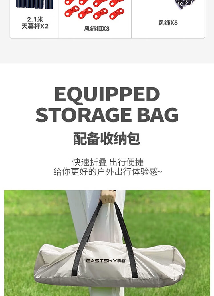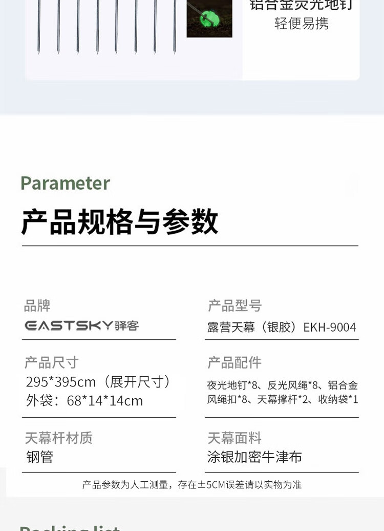 型号:EKH-9004 颜色:香槟金 材质:面布-涂银加密牛津布 规格尺寸:300*400cm(搭建尺寸) 外袋:68x14x14cm 配件:8根夜光地钉、8根反光风绳、8个铝合金风绳扣、收纳袋、19MM撑杆2根