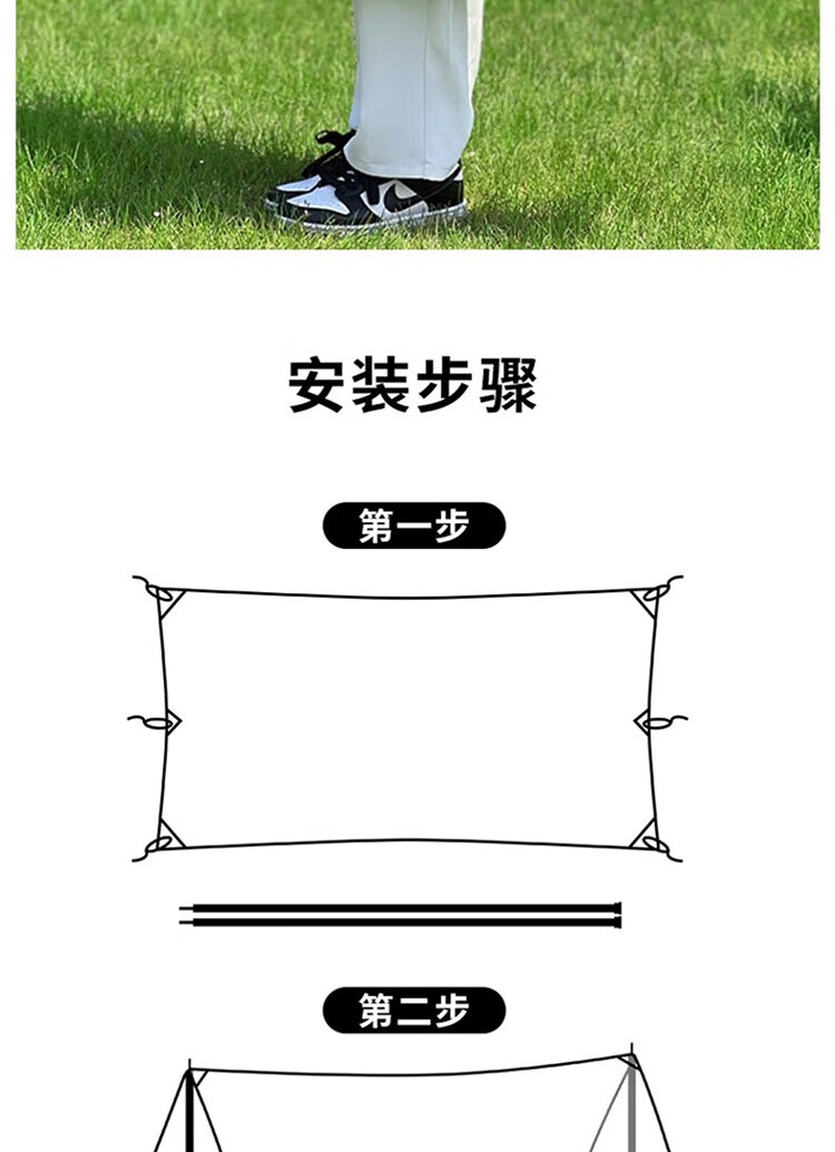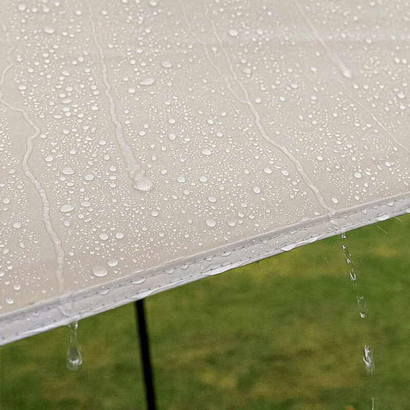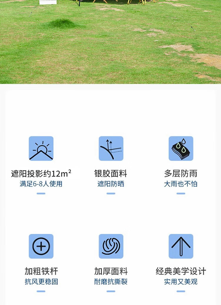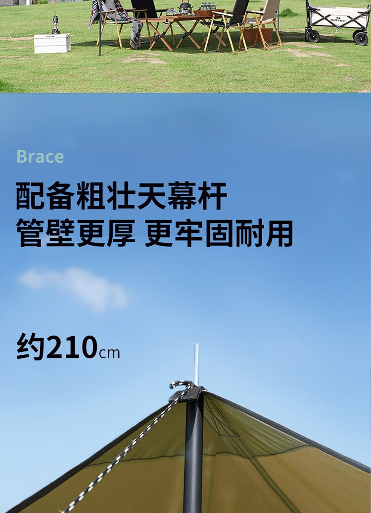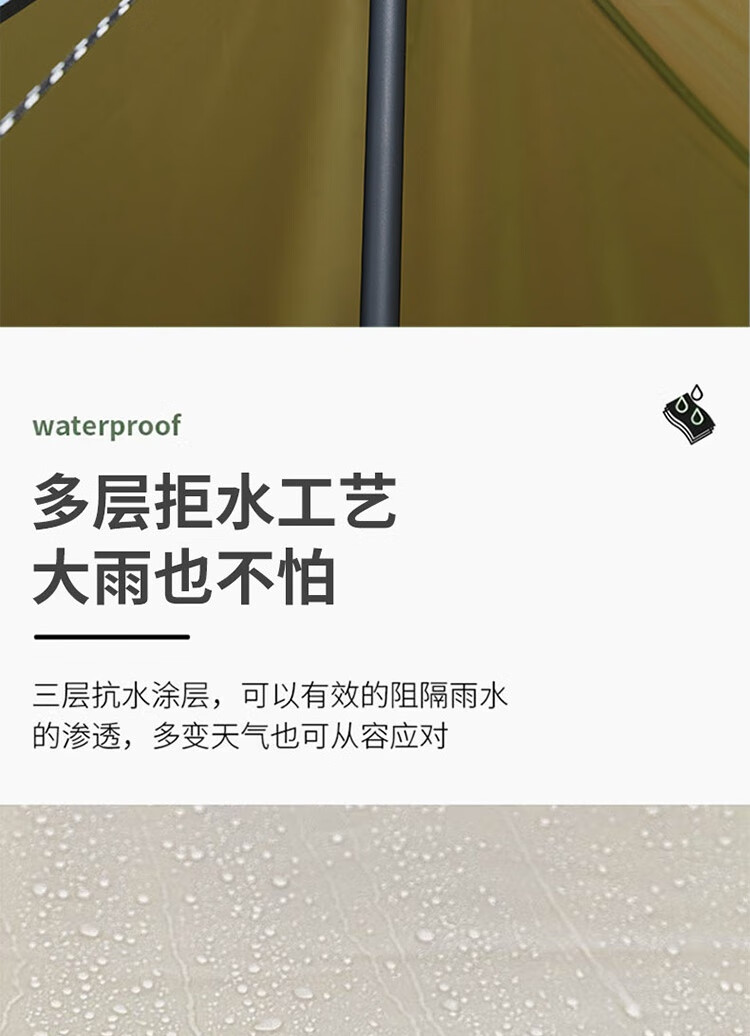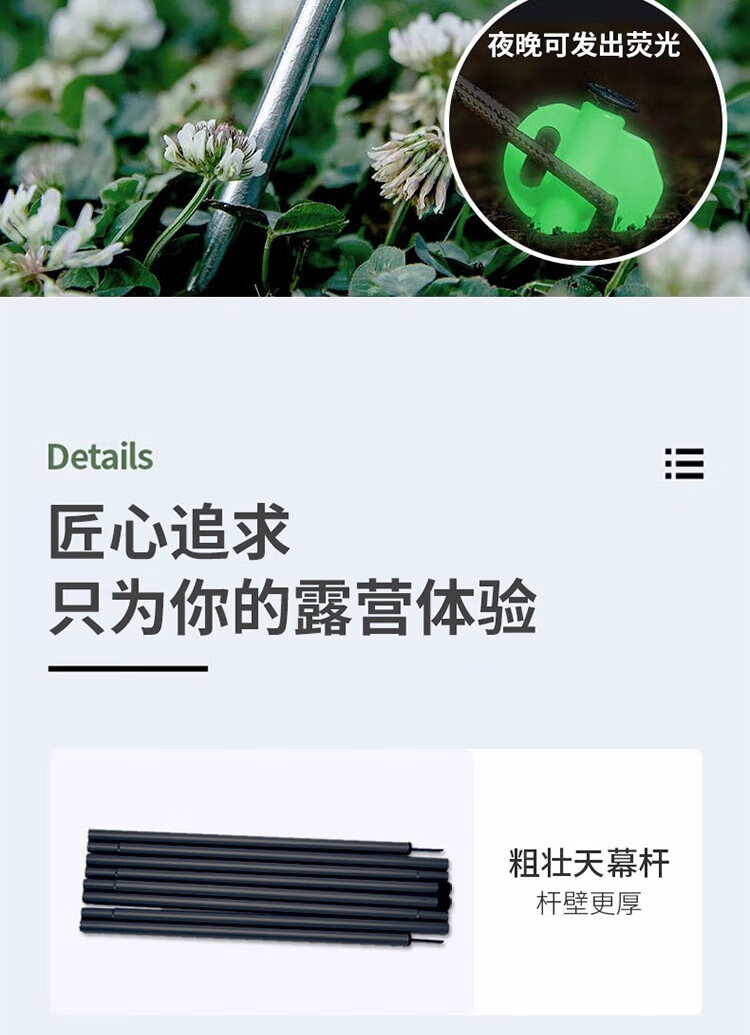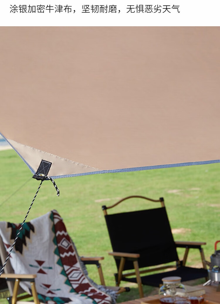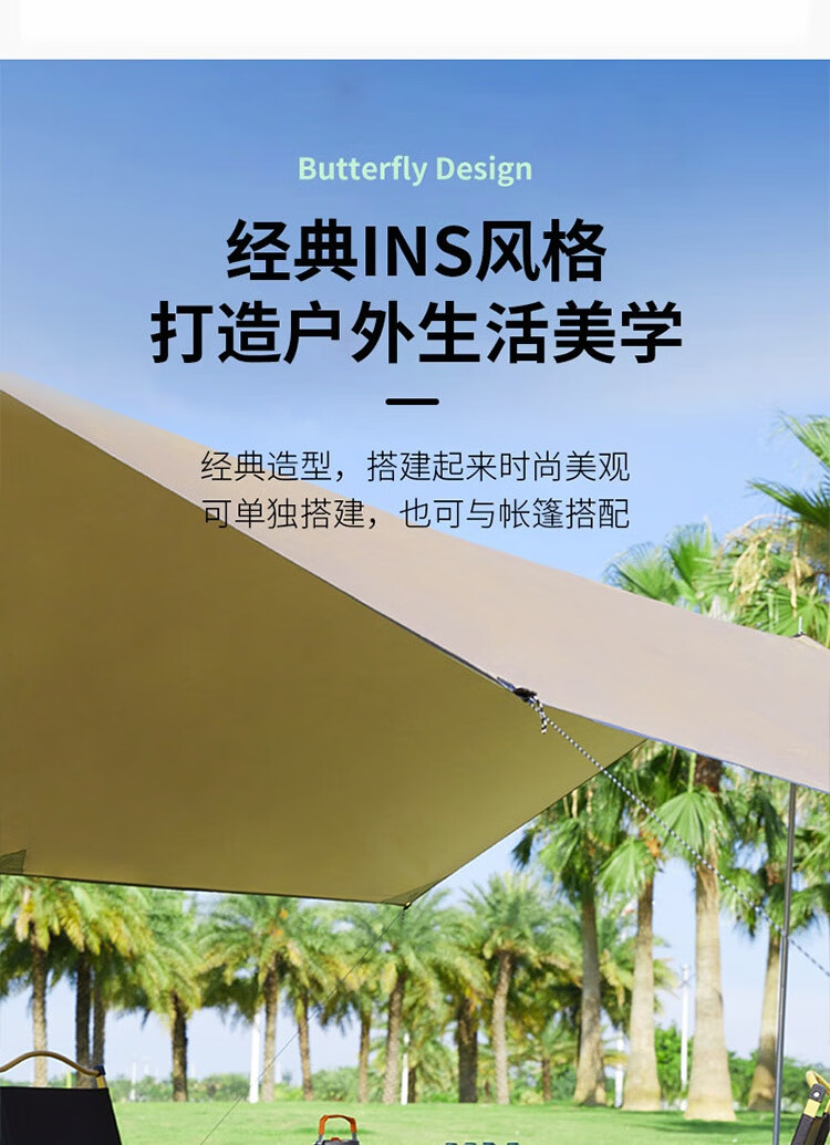 型号:EKH-9004 颜色:香槟金 材质:面布-涂银加密牛津布 规格尺寸:300*400cm(搭建尺寸) 外袋:68x14x14cm 配件:8根夜光地钉、8根反光风绳、8个铝合金风绳扣、收纳袋、19MM撑杆2根