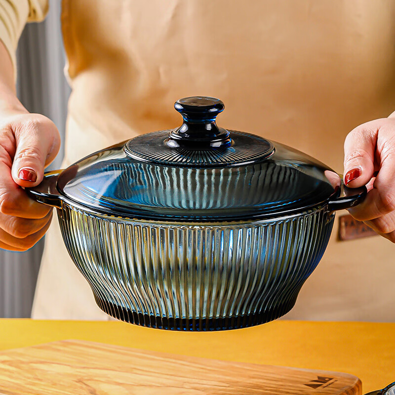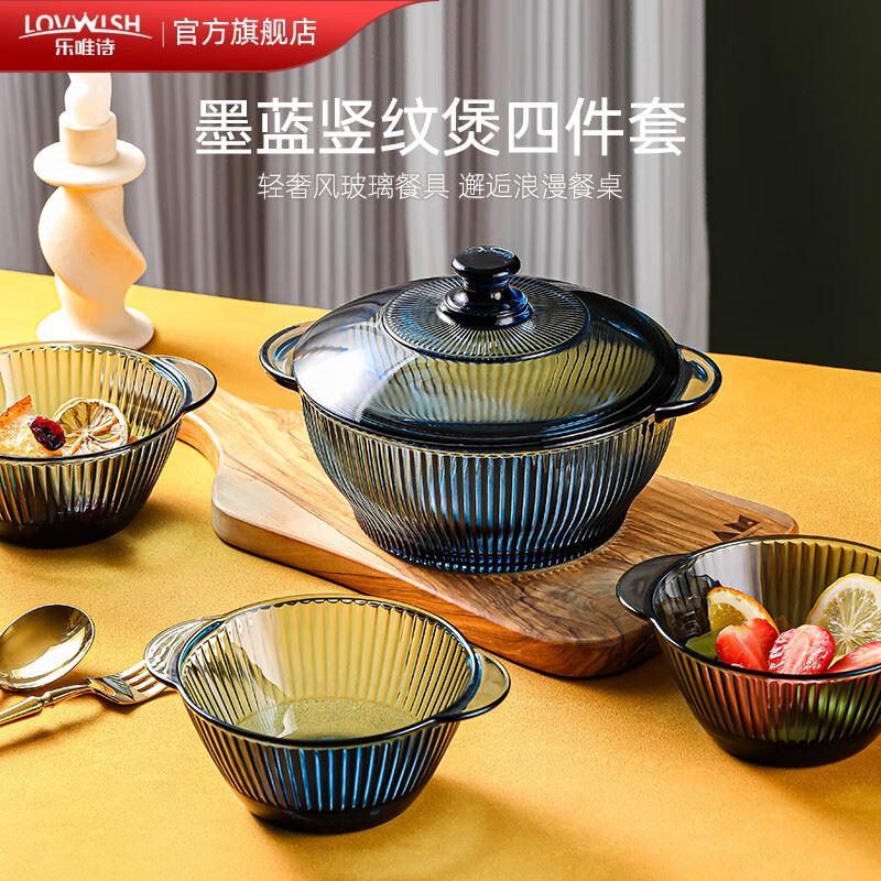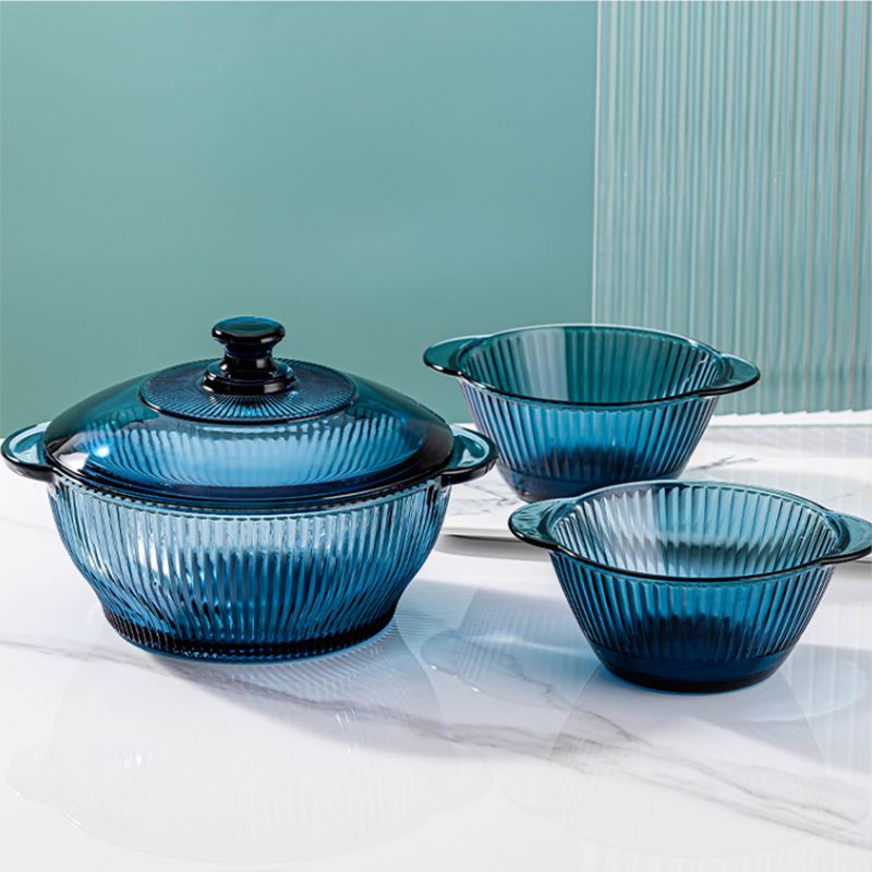 产品材质:钠钙玻璃 产品参数:煲1500ml*1、碗450ml*2 颜 色:墨蓝色 装 箱毛重:8套 /箱,16.8kg 彩盒尺寸:33.5*10.2*20.5cm 外箱体积:43.5*35.5*43.5cm
