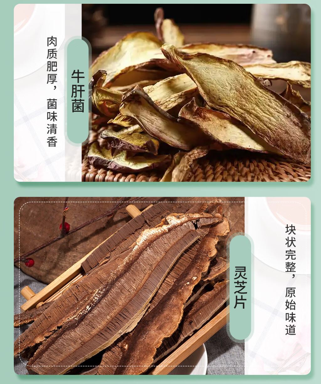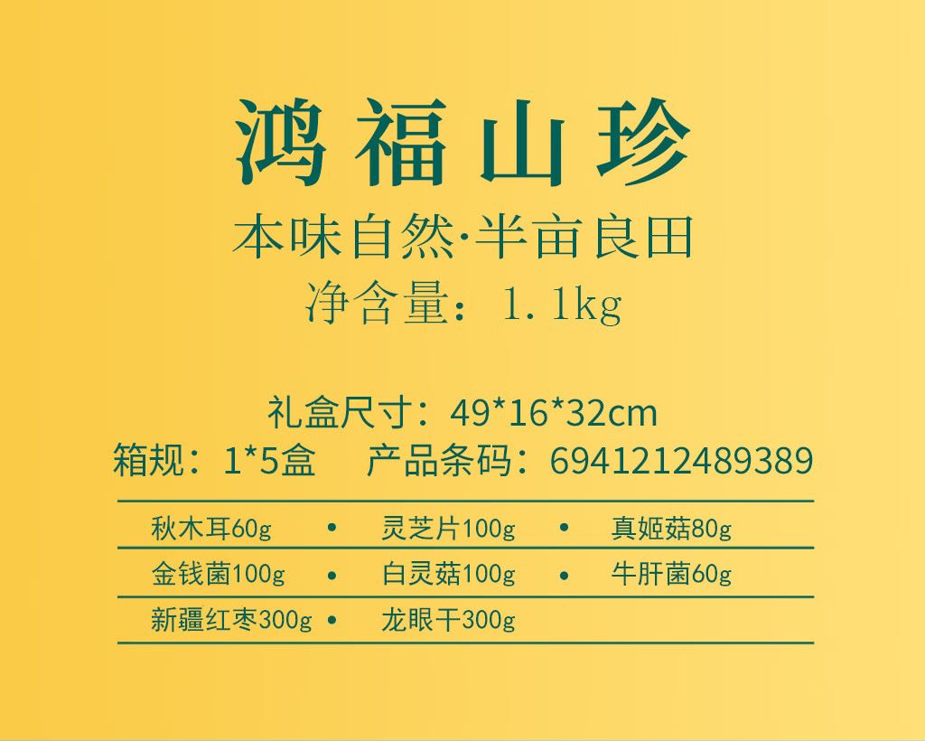 产品配置: 野生秋木耳60g 精选灵芝片100g 精选真姬菇80g 野生金钱菌100g 精选白灵菇100g 野生牛肝菌60g 泰国龙眼干300g 新疆红枣300g 净含量:1.1kg