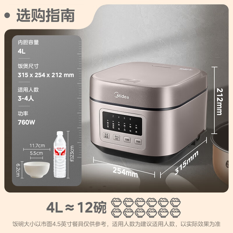 容量:4L定额功率:760W 定额电压:220V~能效等级:三级能效商品条形码:6936718317502 毛重:4.2 kg 包装尺寸:401 x 316 x 263 mm