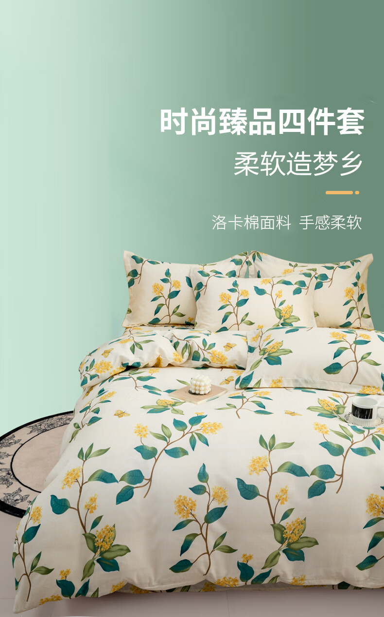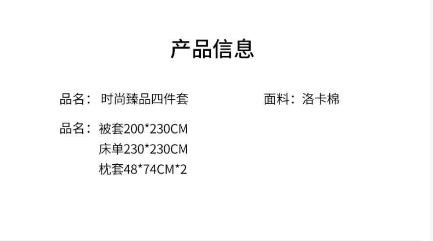 面 料:洛卡棉 规 格:被套200*230cm 床单230*230cm 枕套48*74cm*2 包 装:天地盖/手提盒