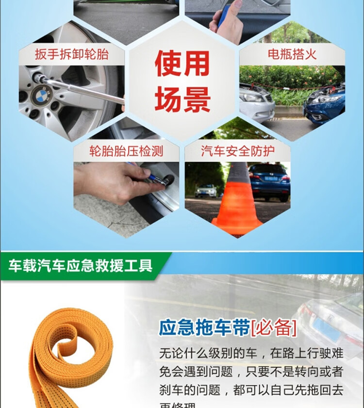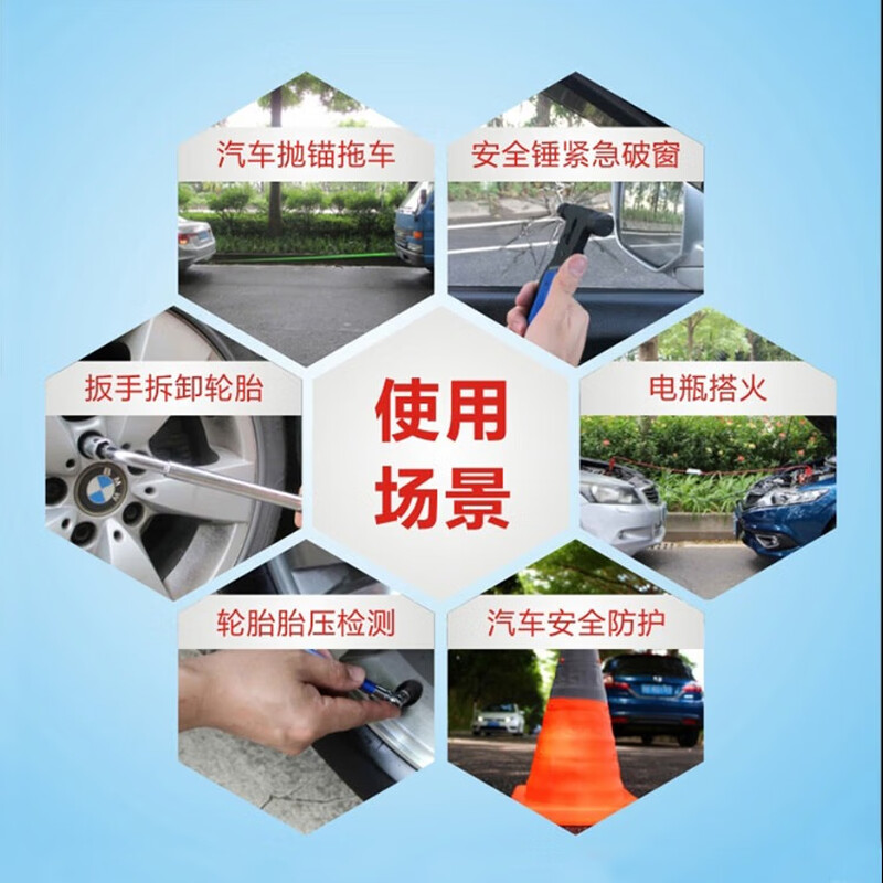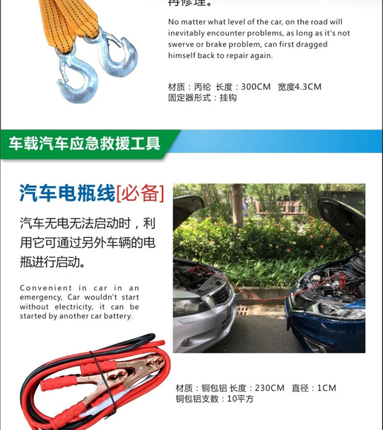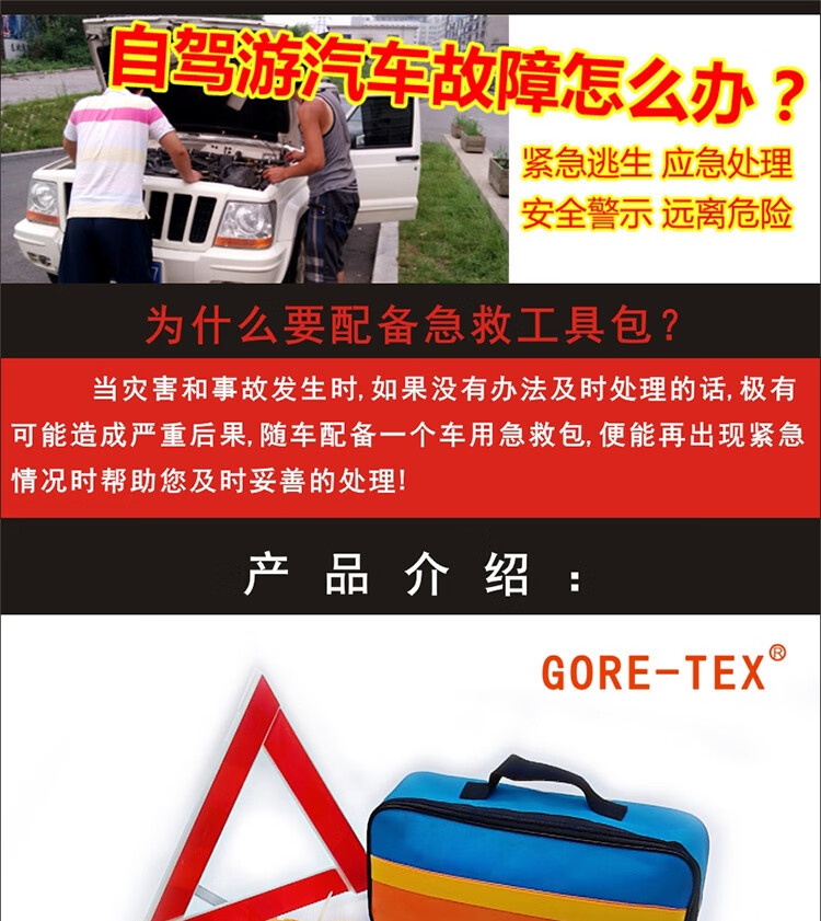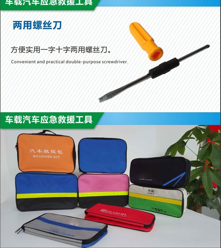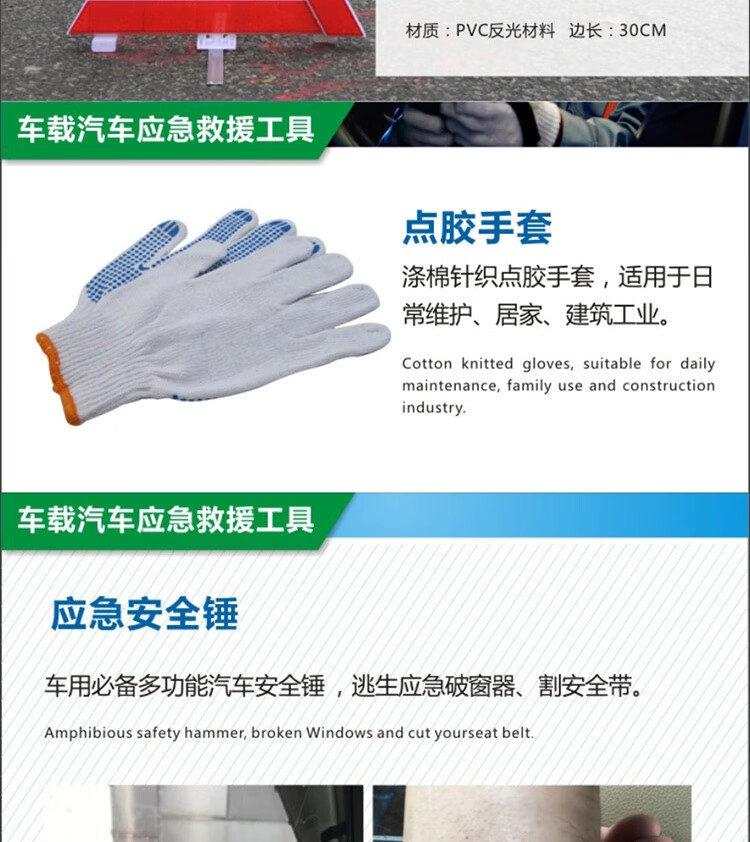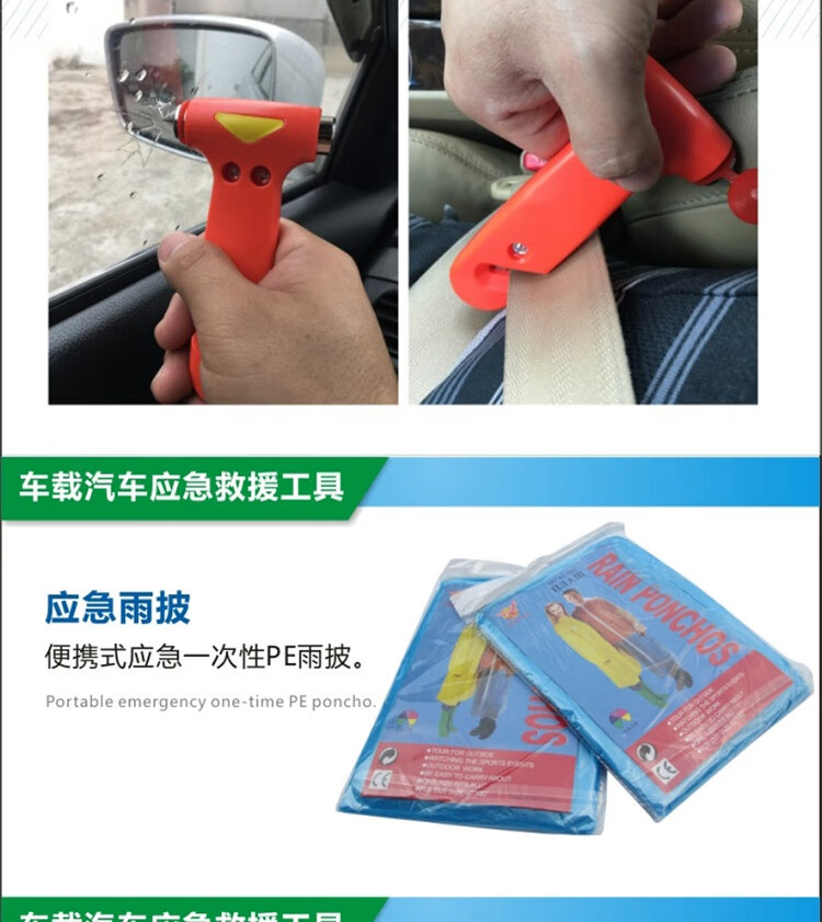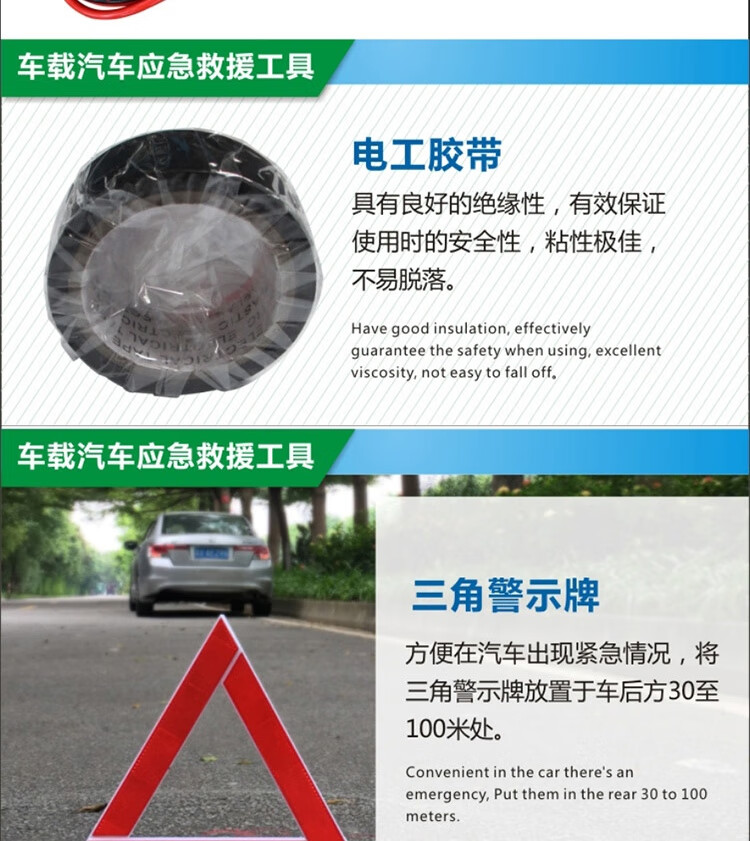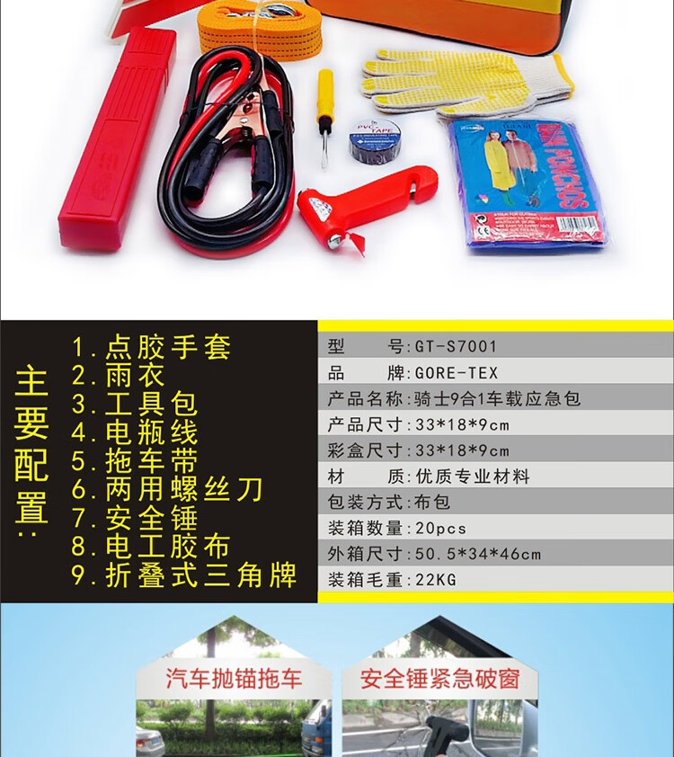 功能: 1.点胶手套 2.雨衣 3.工具包 4.电瓶线 5.折叠式三角牌 6.拖车带 7.两用螺丝刀 8.安全锤 9.电工胶布