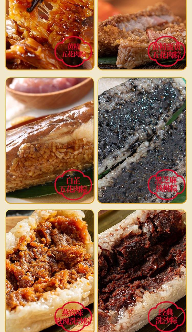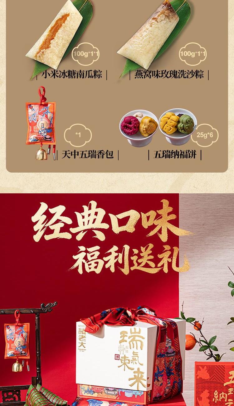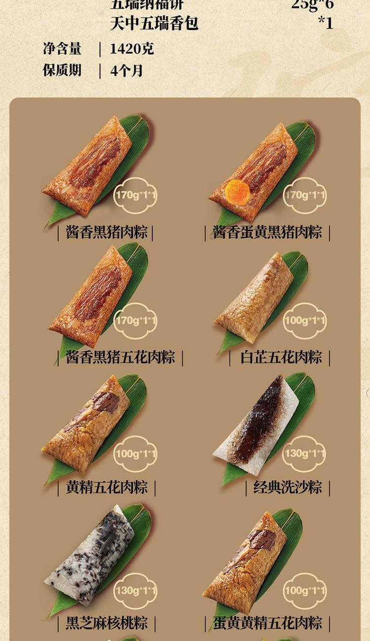 170克*1真空酱香黑猪肉粽 170克*1真空酱香蛋黄黑猪肉粽 170克*1真空酱香黑猪五花肉粽 100克*1真空白芷五花肉粽 100克*1真空黄精五花肉粽 100克*1真空蛋黄黄精五花肉粽 130克*1真空经典洗沙粽 130克*1真空黑芝麻核桃粽 100克*1真空燕窝味玫瑰洗沙粽 100克*1真空小米冰糖南瓜粽 25克*6五瑞纳福饼 天中五瑞香包