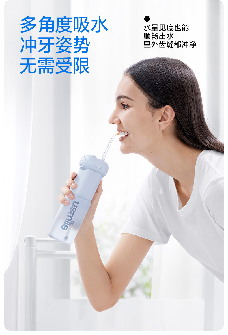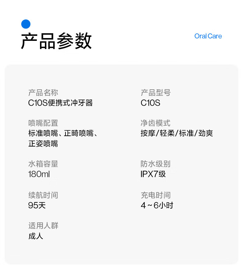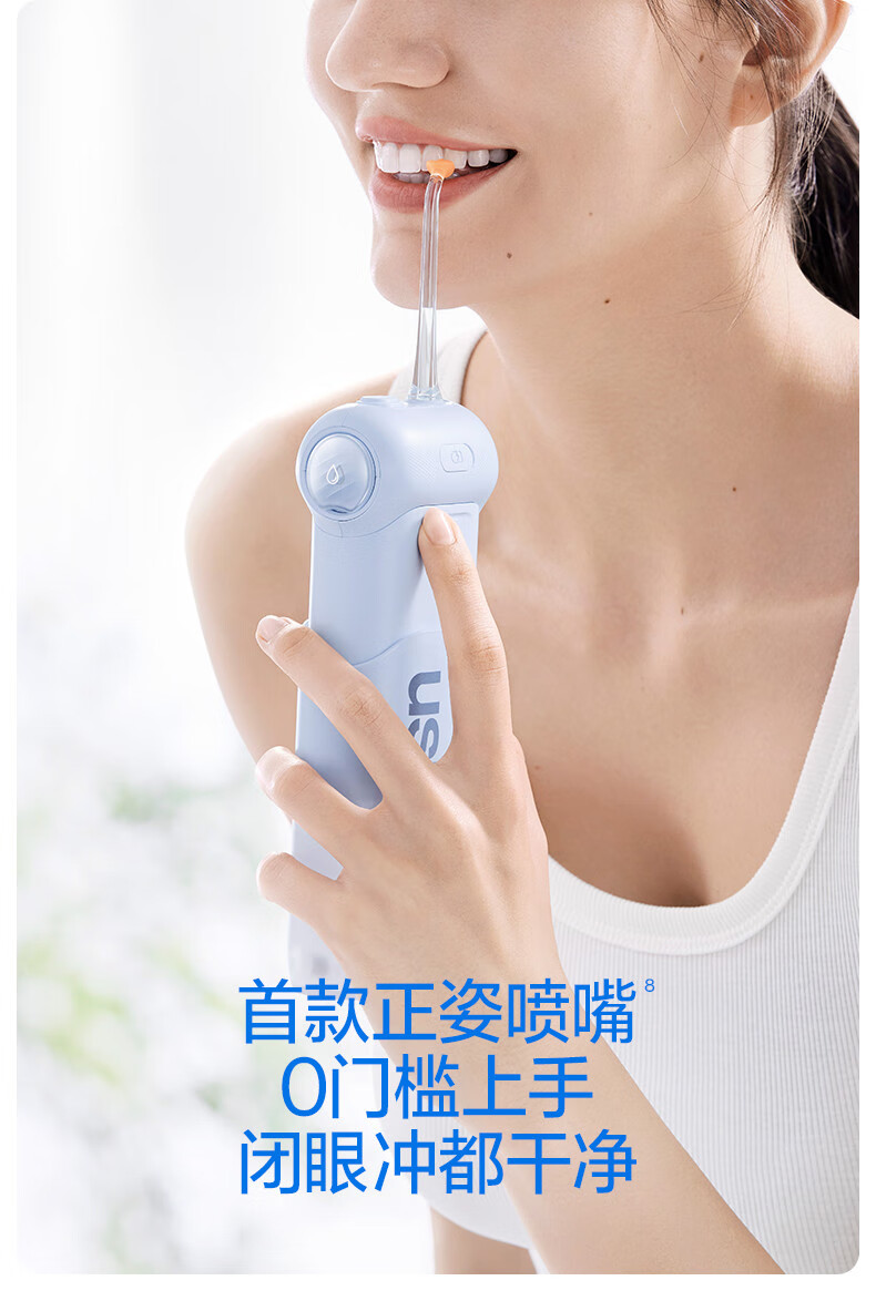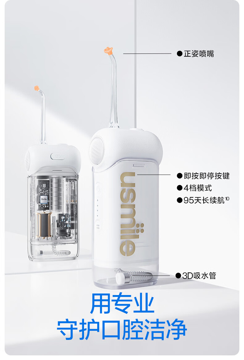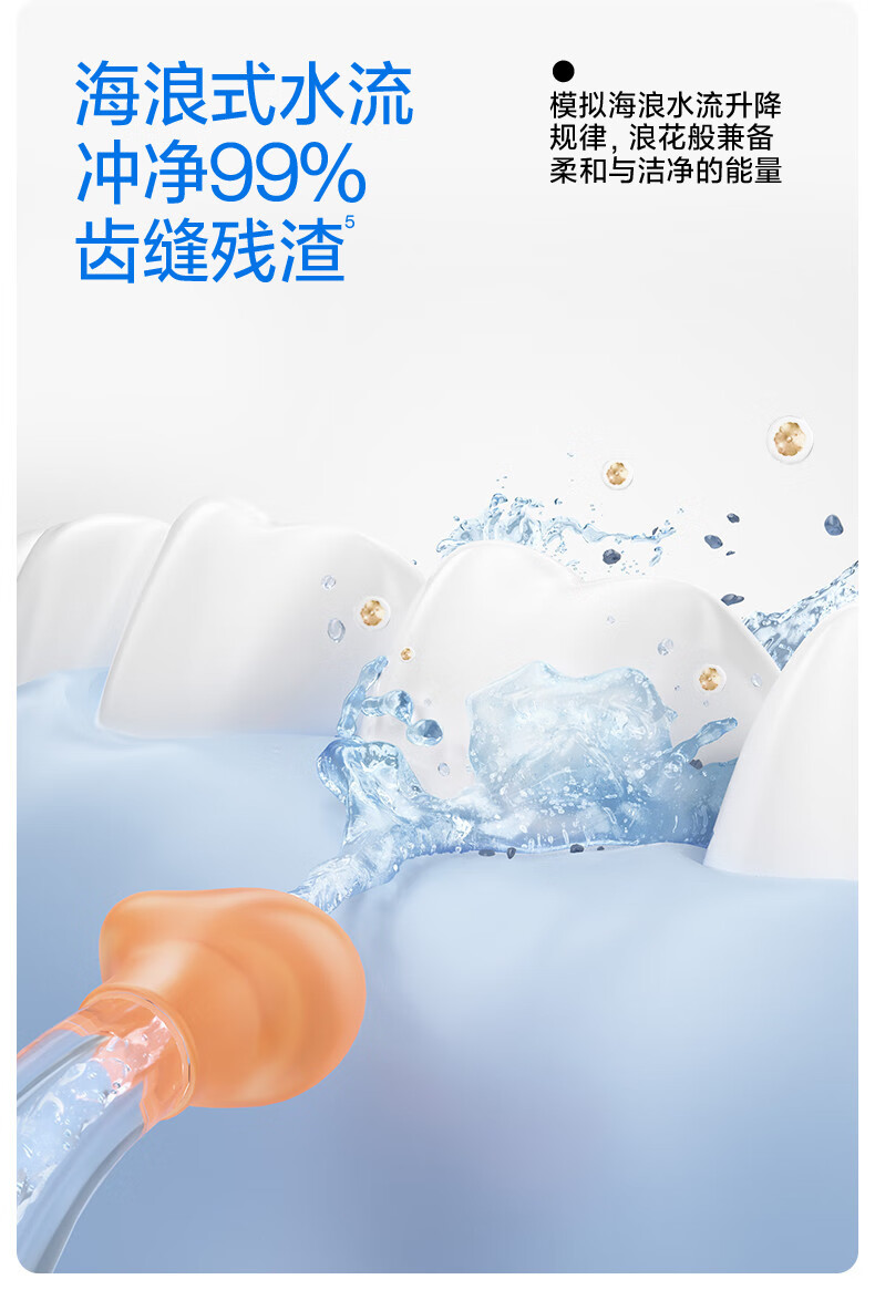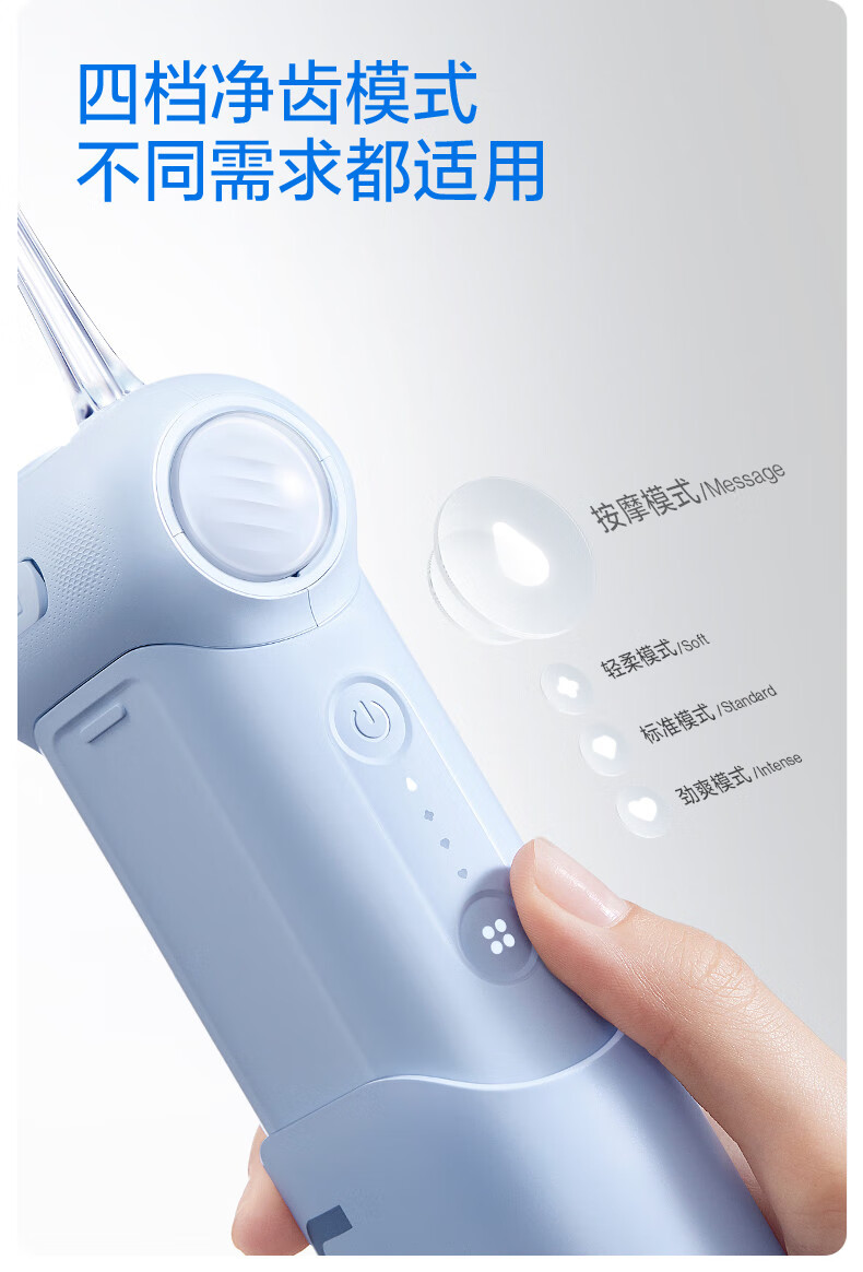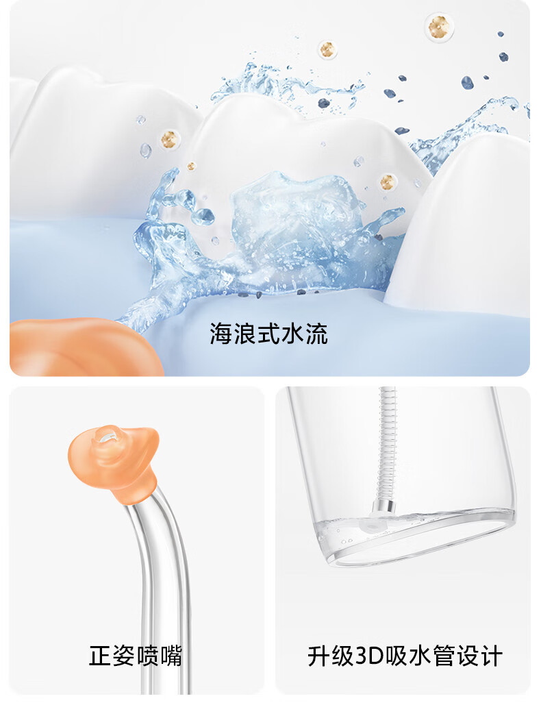 产品规格:209*188*51mm 重量:0.63kg 续航时间:95天 装 箱数:24/箱 69条码:6976466690632 1. 稳定水动能,清洁更高效毫秒级动态水量变化,温和舒适 正姿设计,一秒上手好操作 2.90°水流垂直清洁,牙缝更洁净 4种模式(按摩/轻柔/标准/劲爽) 3.3种喷嘴(正姿/正畸/标准) 4.可拆卸水箱,食品级材质;续航强劲,可使用95天 5.IPX7级防水,全机身可水洗