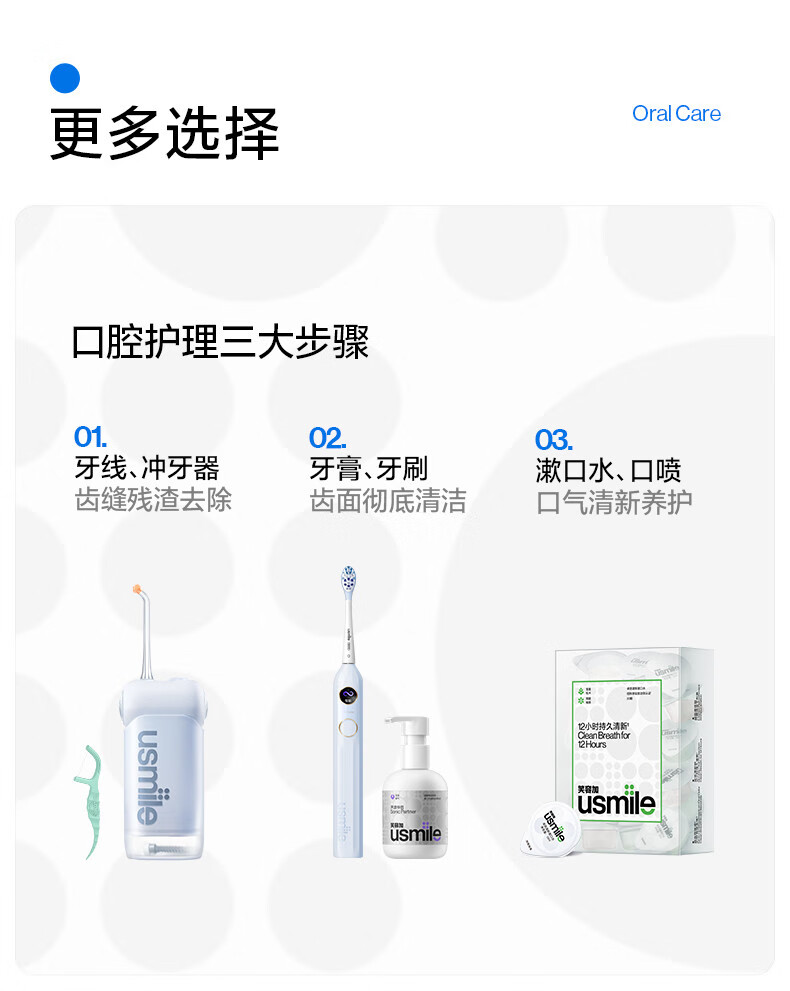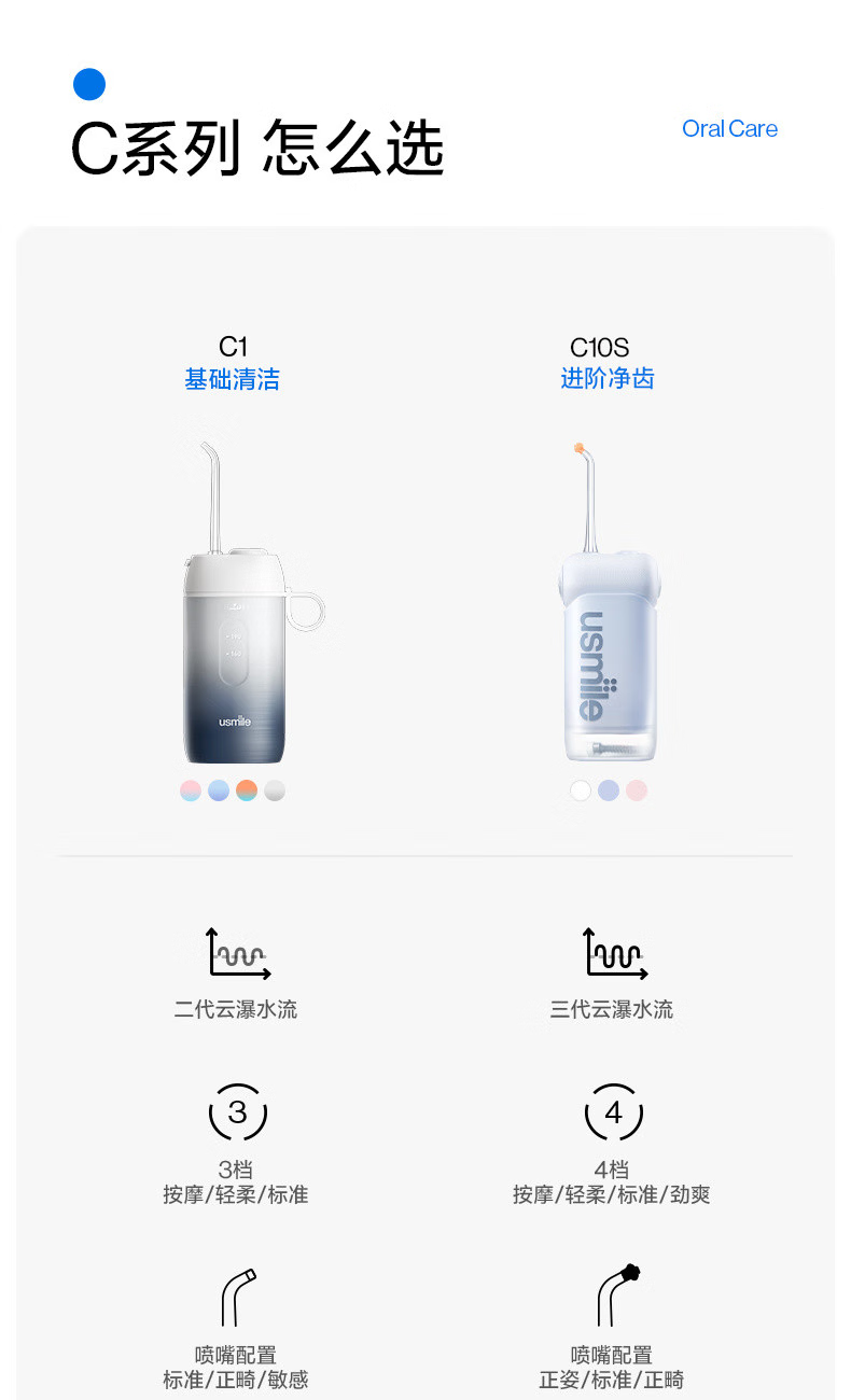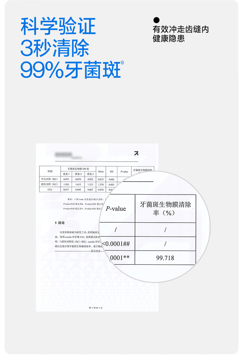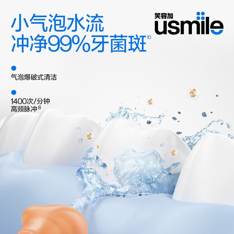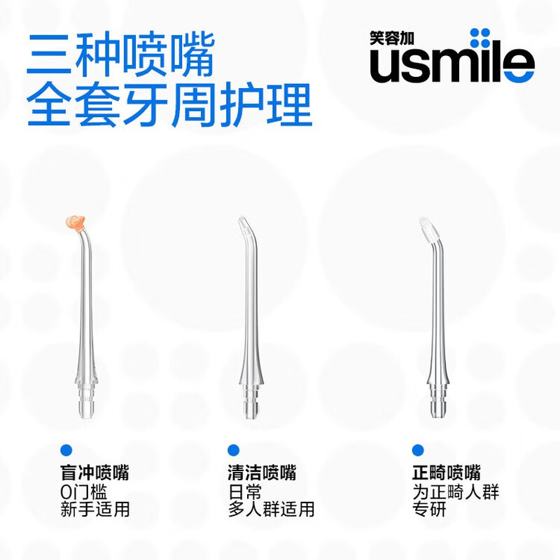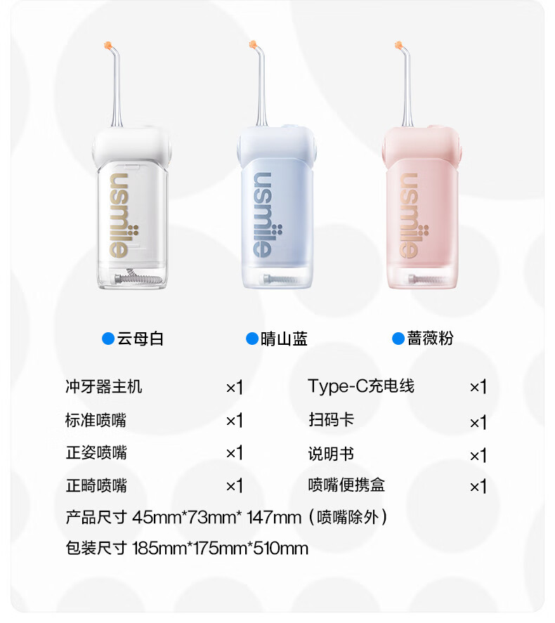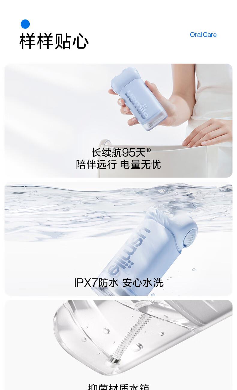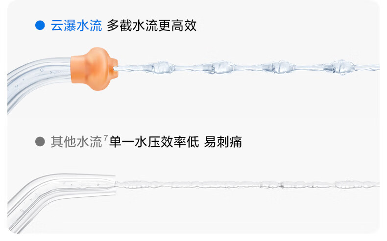 产品规格:209*188*51mm 重量:0.63kg 续航时间:95天 装 箱数:24/箱 69条码:6976466690632 1. 稳定水动能,清洁更高效毫秒级动态水量变化,温和舒适 正姿设计,一秒上手好操作 2.90°水流垂直清洁,牙缝更洁净 4种模式(按摩/轻柔/标准/劲爽) 3.3种喷嘴(正姿/正畸/标准) 4.可拆卸水箱,食品级材质;续航强劲,可使用95天 5.IPX7级防水,全机身可水洗