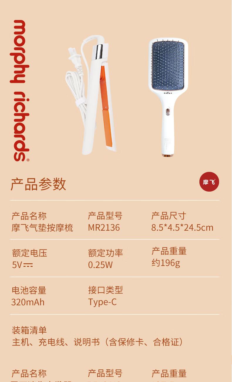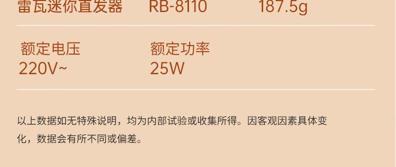 摩飞气垫按摩梳 产品型号:MR2136 额定电压:5V-额定电流:0.06A 电池容量:320mAh/3.7V- 额定功率:0.25W 产品净重:196g 产地:广东·东莞 执行标准:GB4706.1-2005 GB4706.10-2008 雷瓦迷你直发器 产品型号:RB-8110 额定电压:220V~ 额定功率:25W 产品净重:187.5g 产地:浙江·宁波 执行标准:GB4706.1-2005 GB4706.15-2008