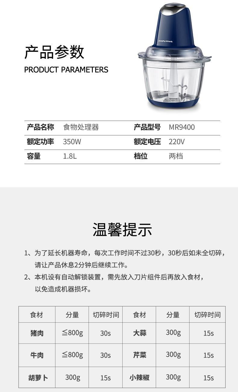 功率:350W 容量:1.8L 重量:2.1kg 装 箱数:1台 /箱 产品尺寸:207*207*271 外箱尺寸:360*270*208 颜色:经典蓝