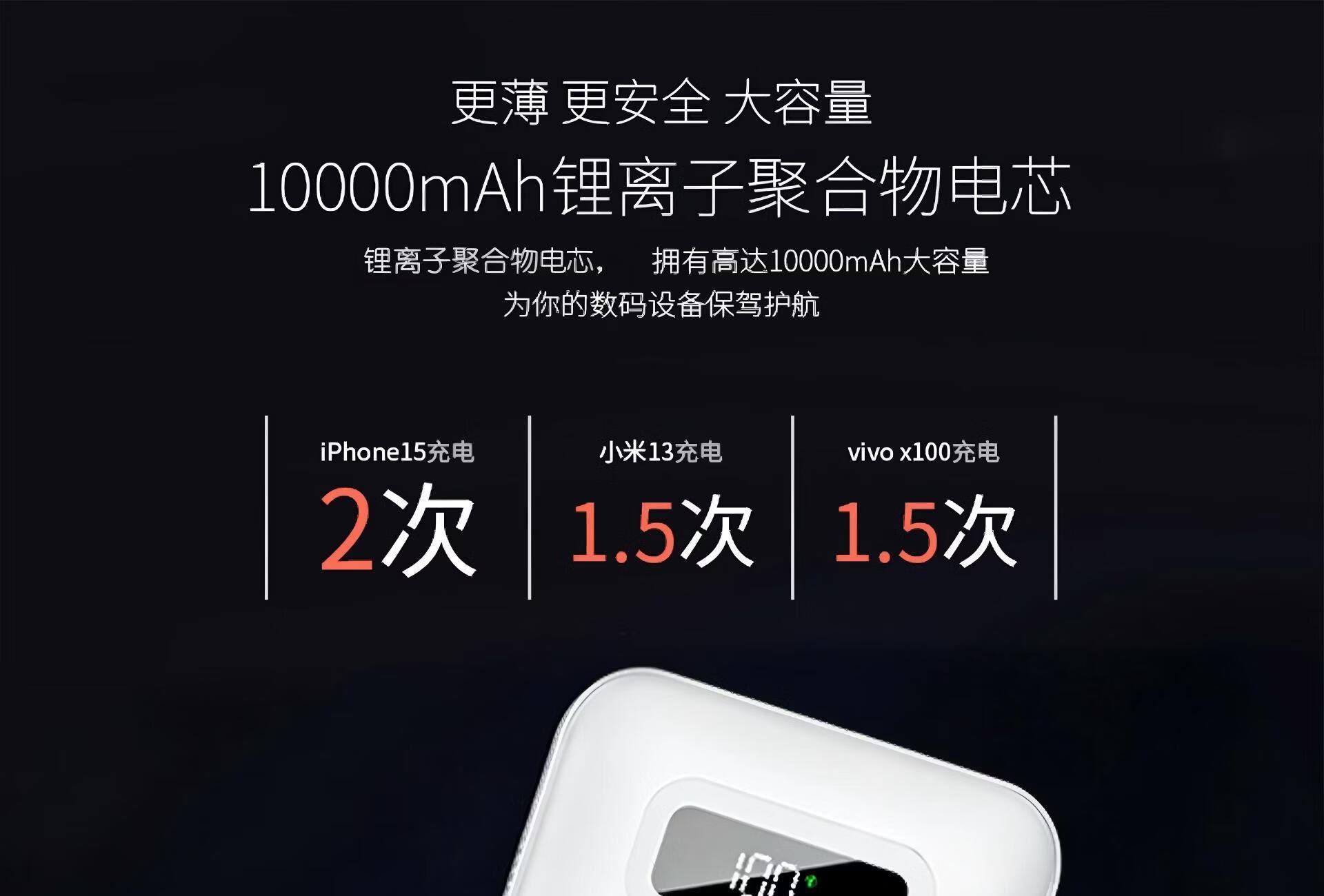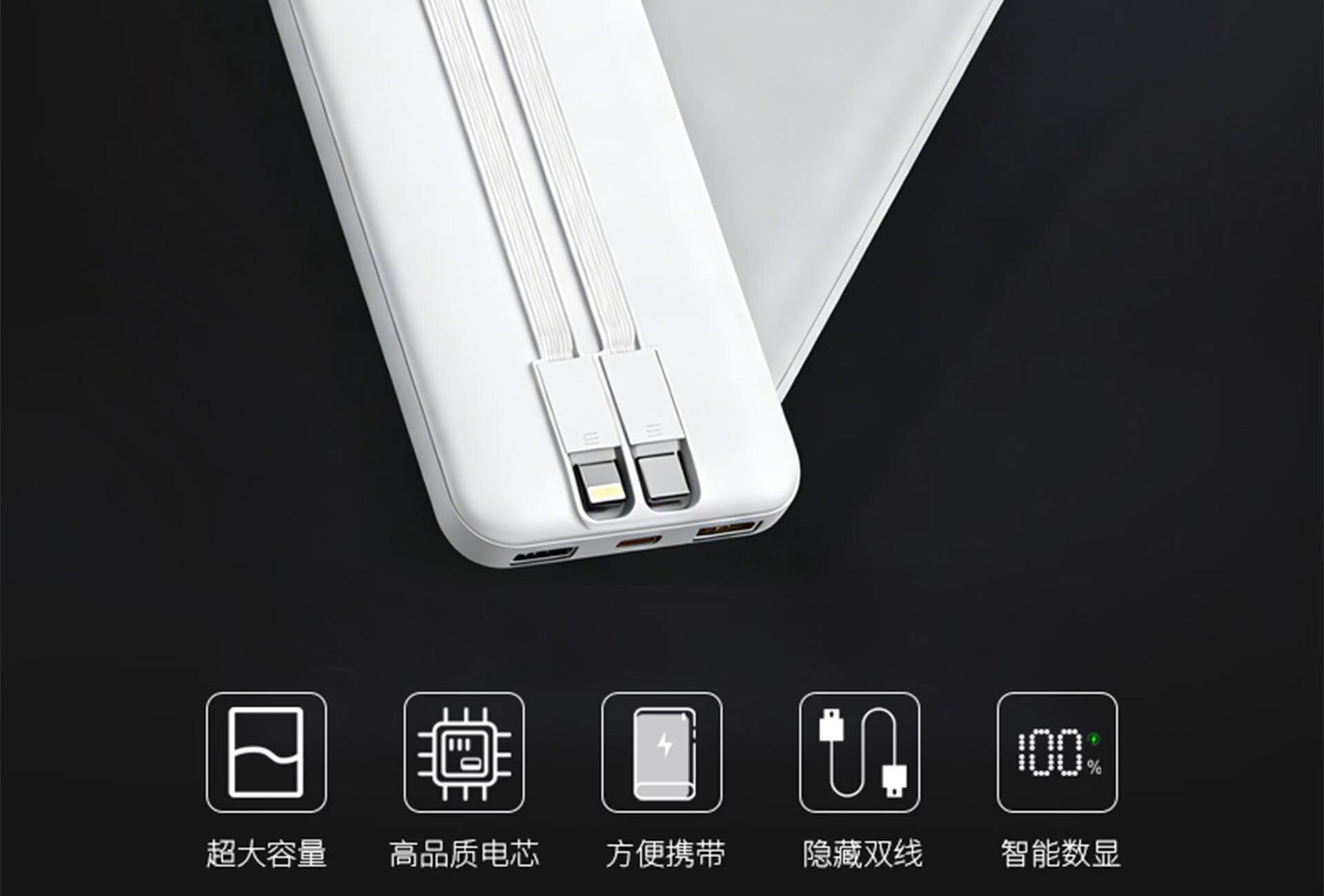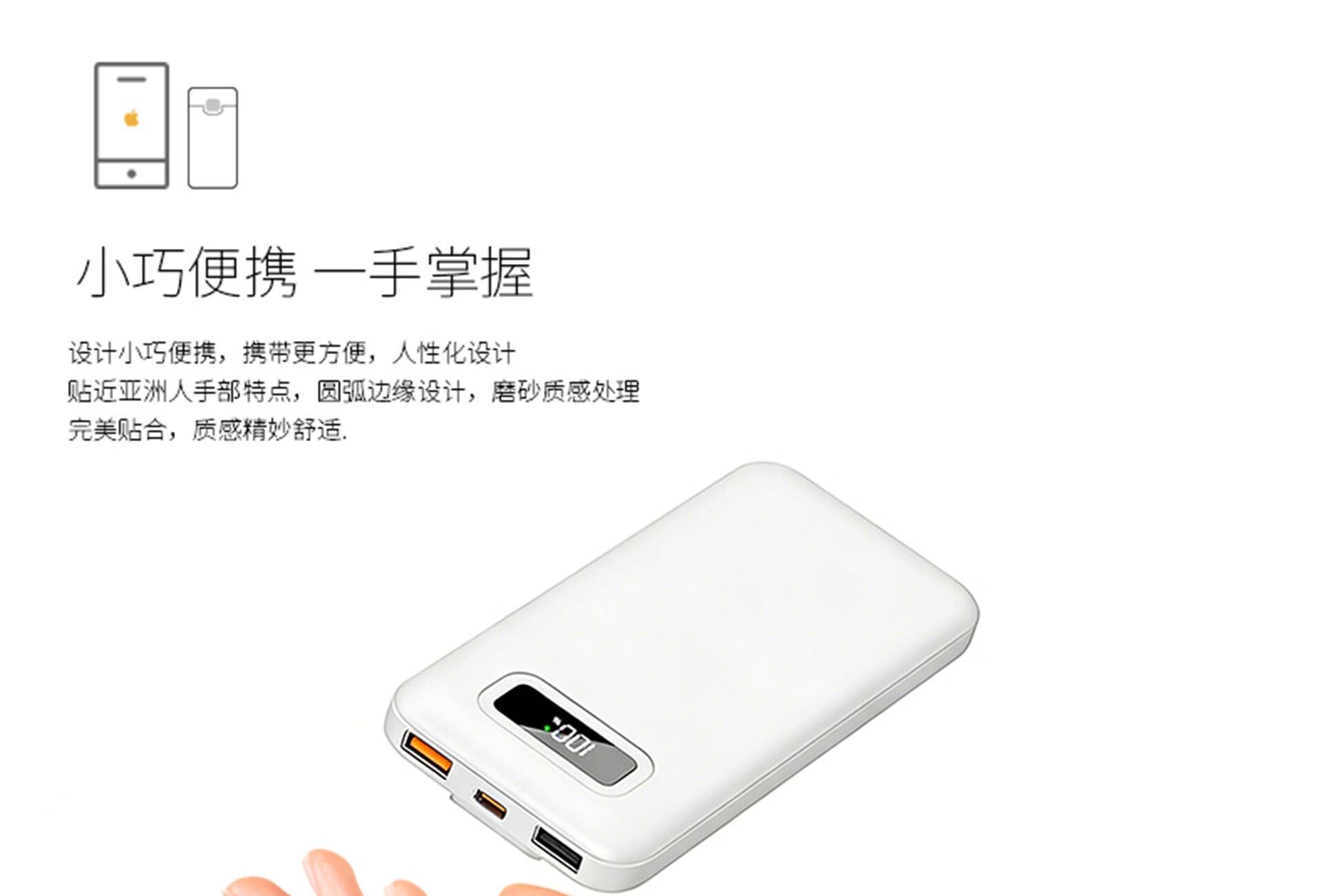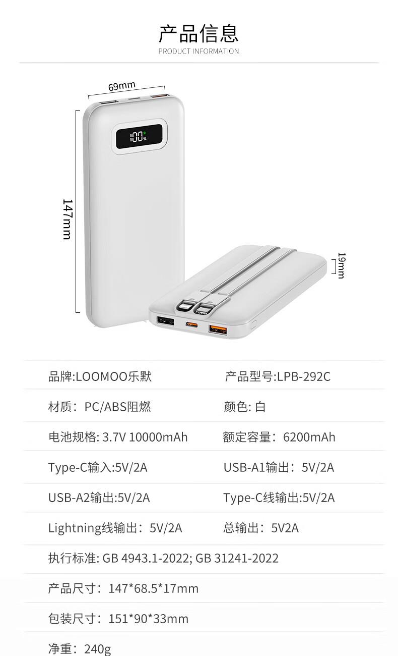 产品型号:LPB-292C 材质:PC/ABS阻燃 电池规格: 3.7V 10000mAh 额定容量:6200mAh TYPE-C输入:5V=2A USB-A1输出:5V=2A USB-A2输出:5V=2A Type-C线输出:5V=2A Lightning线输出:5V=2A 总输出:5V=2A 颜色: 白 69码:6970998501923