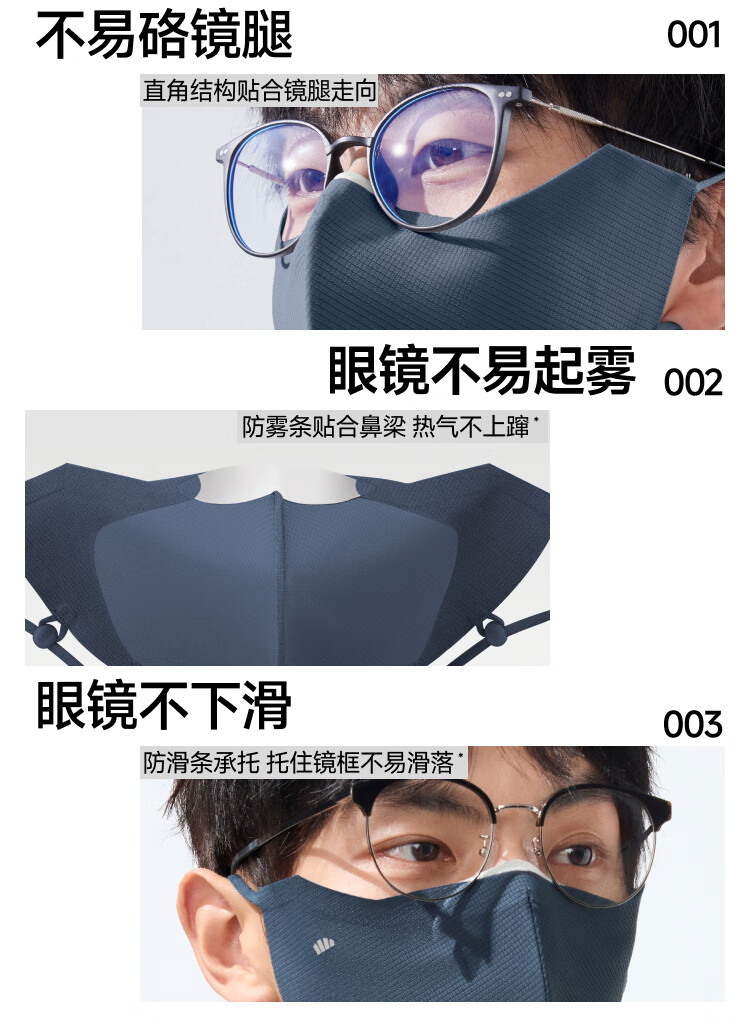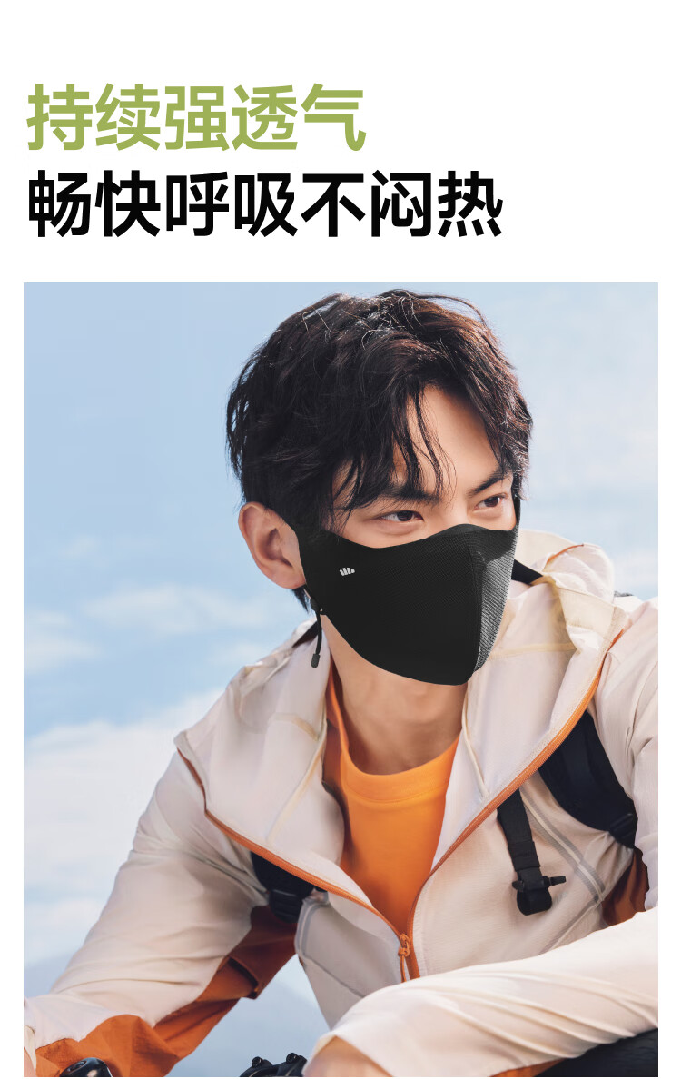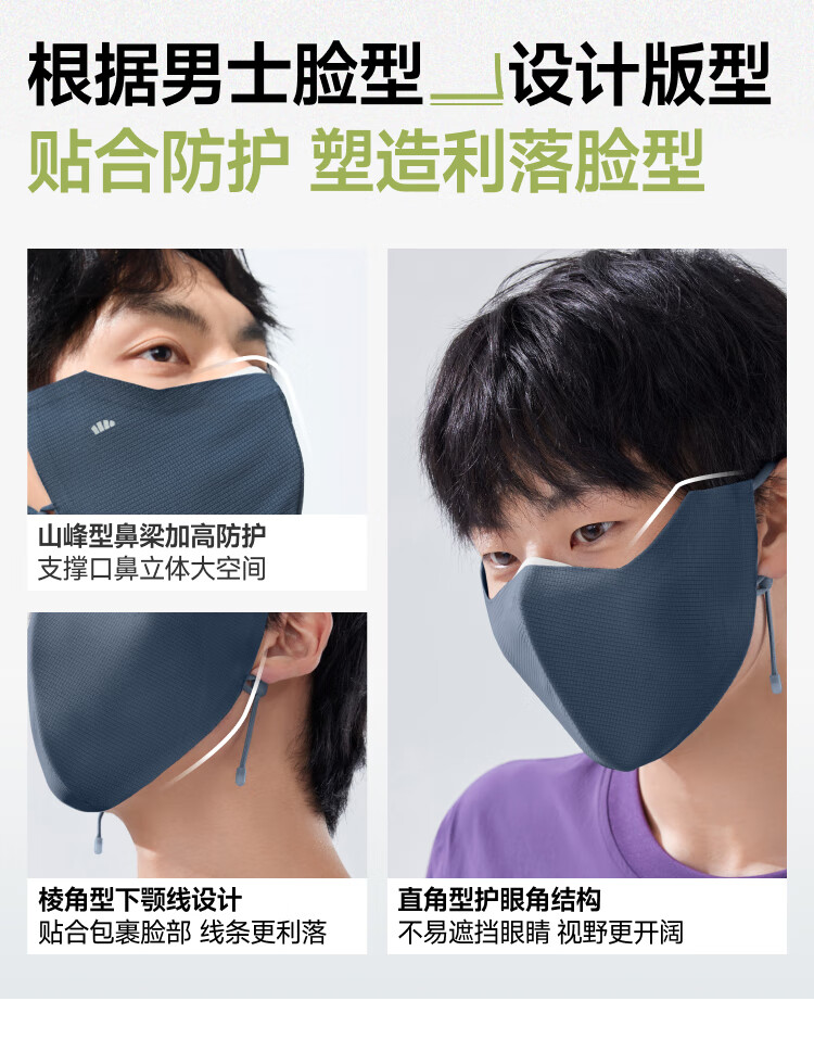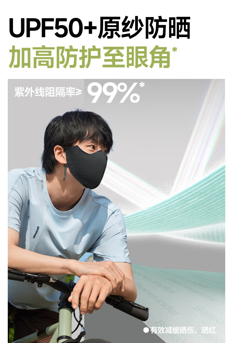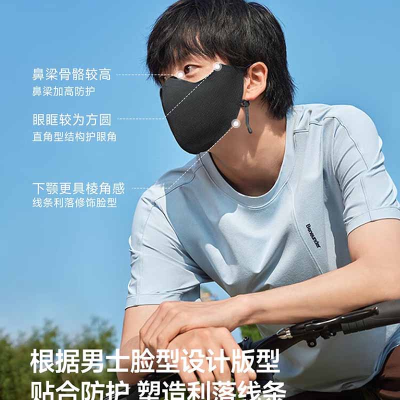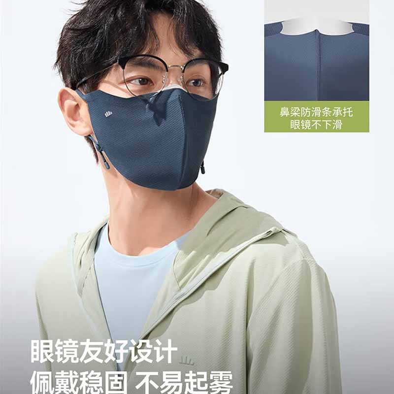 眼镜友好设计佩戴稳固、不易起雾 透气率优于普通口罩2.4倍、畅快呼吸不闷热 UPF50+原纱防晒有效阻挡紫外线、不怕晒伤晒红