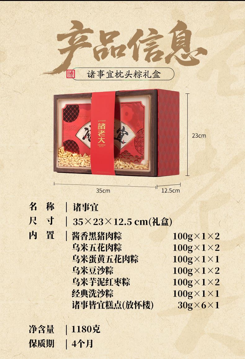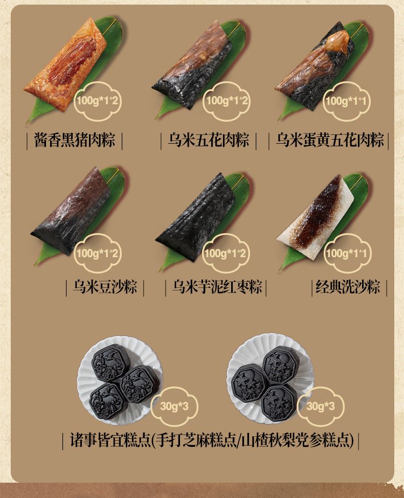 100克*2真空酱香黑猪肉粽 100克*2真空乌米五花肉粽 100克*1真空乌米蛋黄五花肉粽 100克*2真空乌米豆沙粽 100克*2真空乌米芋泥红枣粽 100克*1真空经典洗沙粽 30克*6诸事皆宜糕点(放怀楼)(30克手打芝麻糕点x3/30克山楂秋梨党参糕点x3)