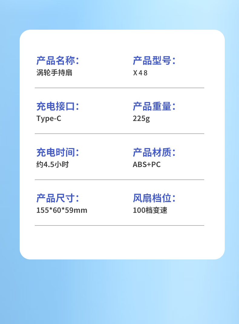 型 号:X48 产品颜色:白色 材 质:ABS+电子元器件+铝合金 电池容量:4000mAh 续航时间:3-5小时 额定电压:5V 风力档位:100档变速 产品尺寸:160*56*50mm 包装尺寸:164*60*56mm