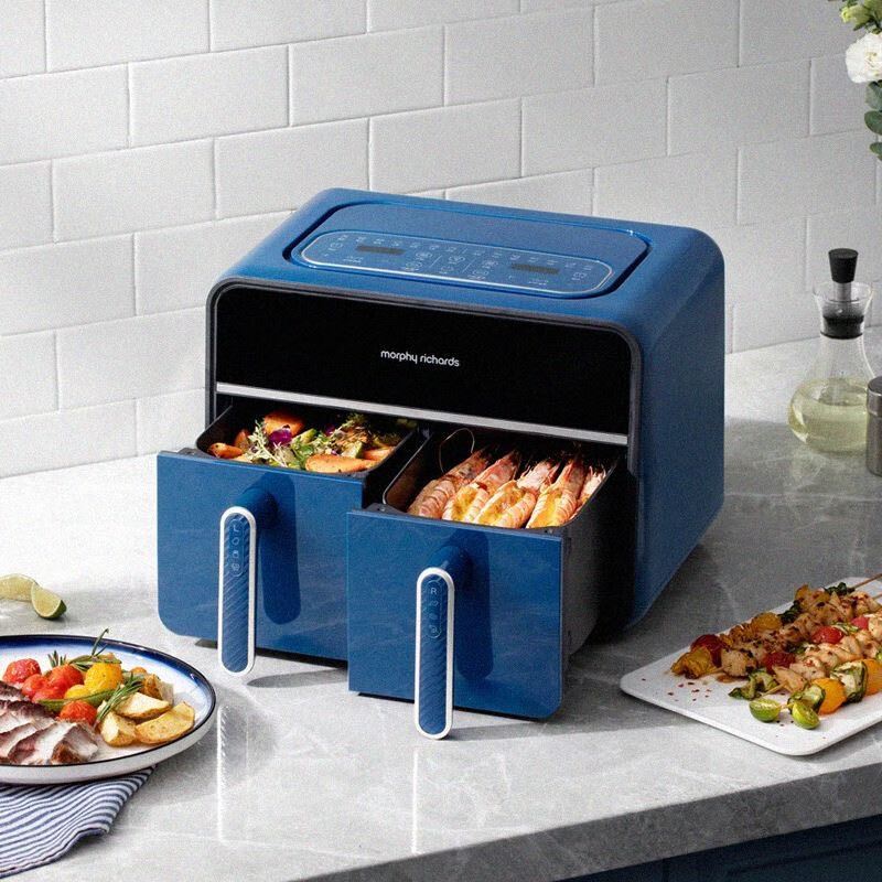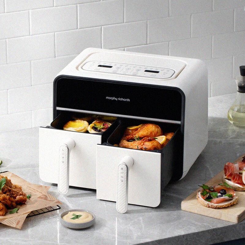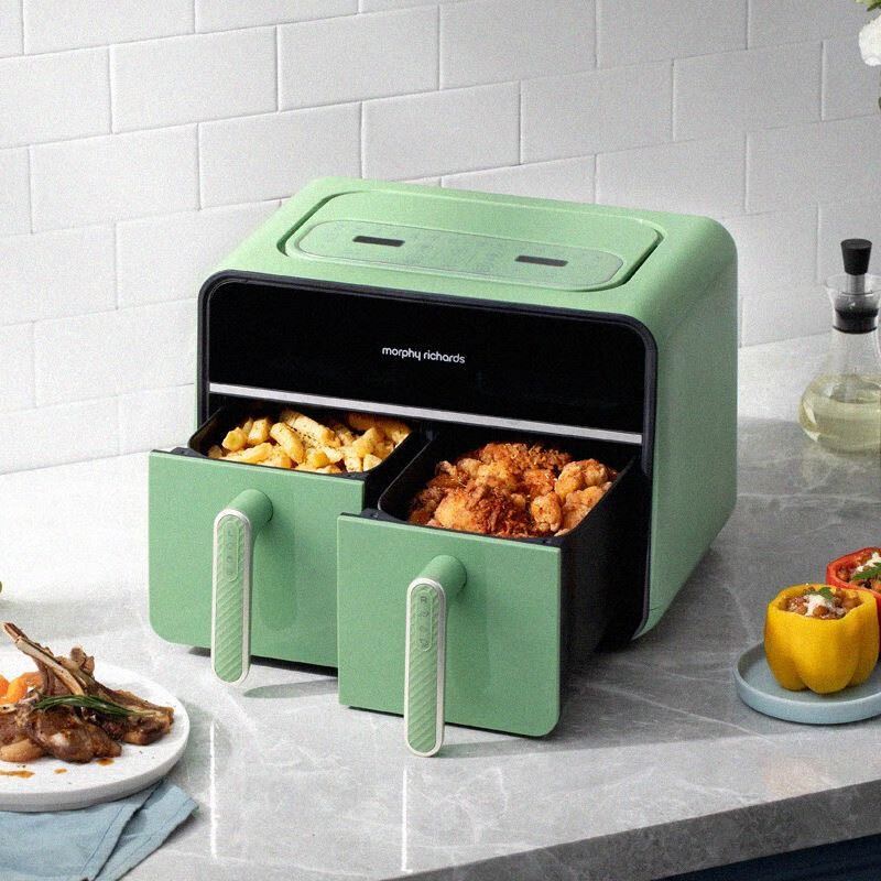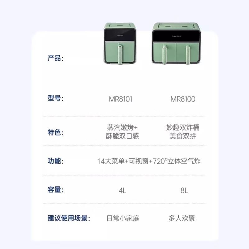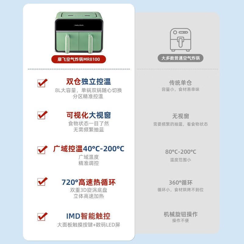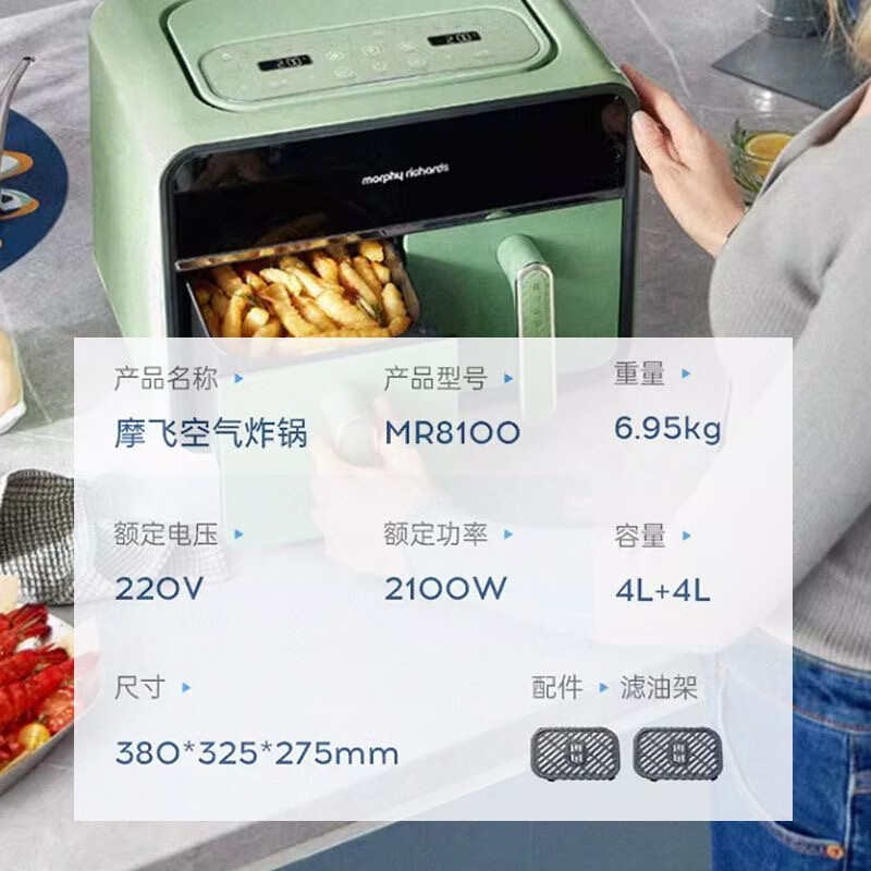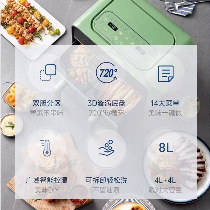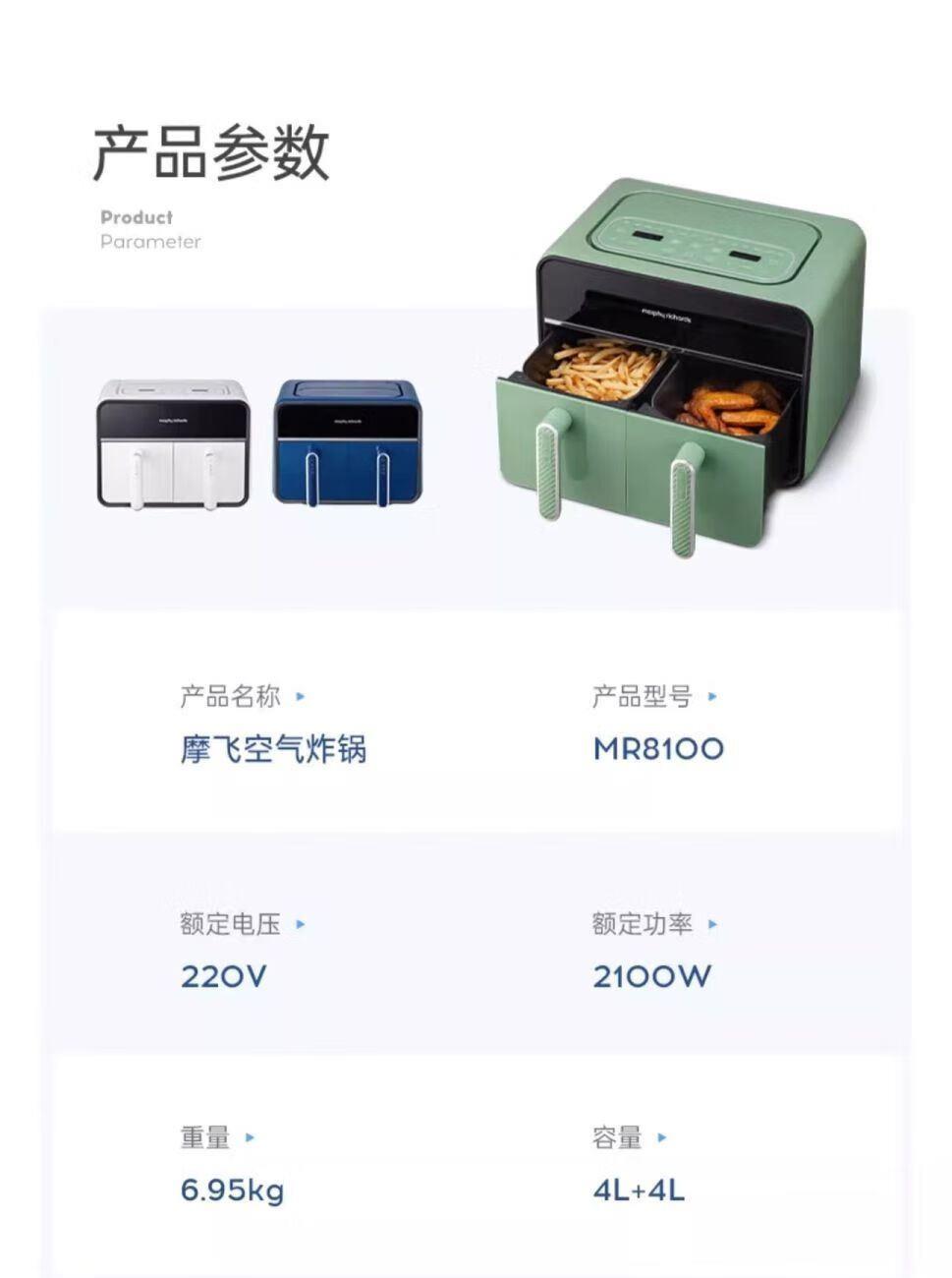 功率:2100W 重量:9.45kg 装 箱数:1台 /箱 产品尺寸: 380*325*275 外箱尺寸: 452*402*362 颜色:白色,蓝色,绿色 1、左右双锅,美食不串味; 2、专 利漩涡底盘,720°循环加热; 3、14大菜单,美味一键做; 4、分体式滤油架,轻松拆洗; 5、抽篮暂停,随意加料; 6、视窗&炉灯,食物一目了然; 7、4L+4L派对大容量; 8、40~200°C广域控温; 9、智能变频,分区控温; 10、食品级材质,健康安全。