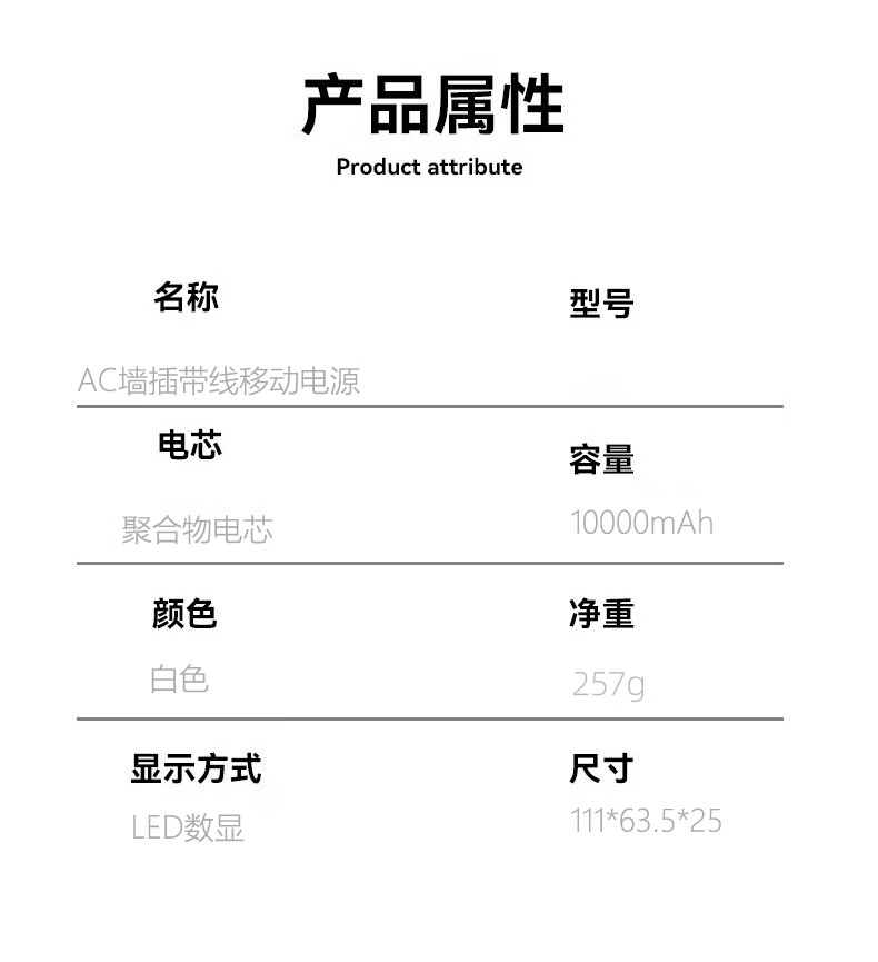 型号:Y08 容量:10000mAh(典型值) 颜色:白色(黑色500起订) 材质:外壳ABS 线TPE 产品尺寸:111*63.5*25mm 包装尺寸:168*103*36mm 单个重量:250g