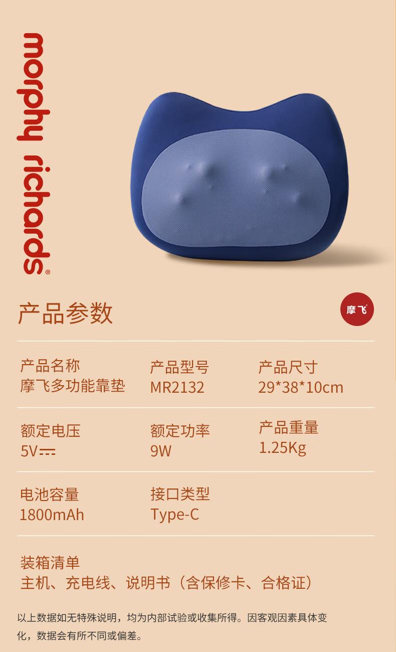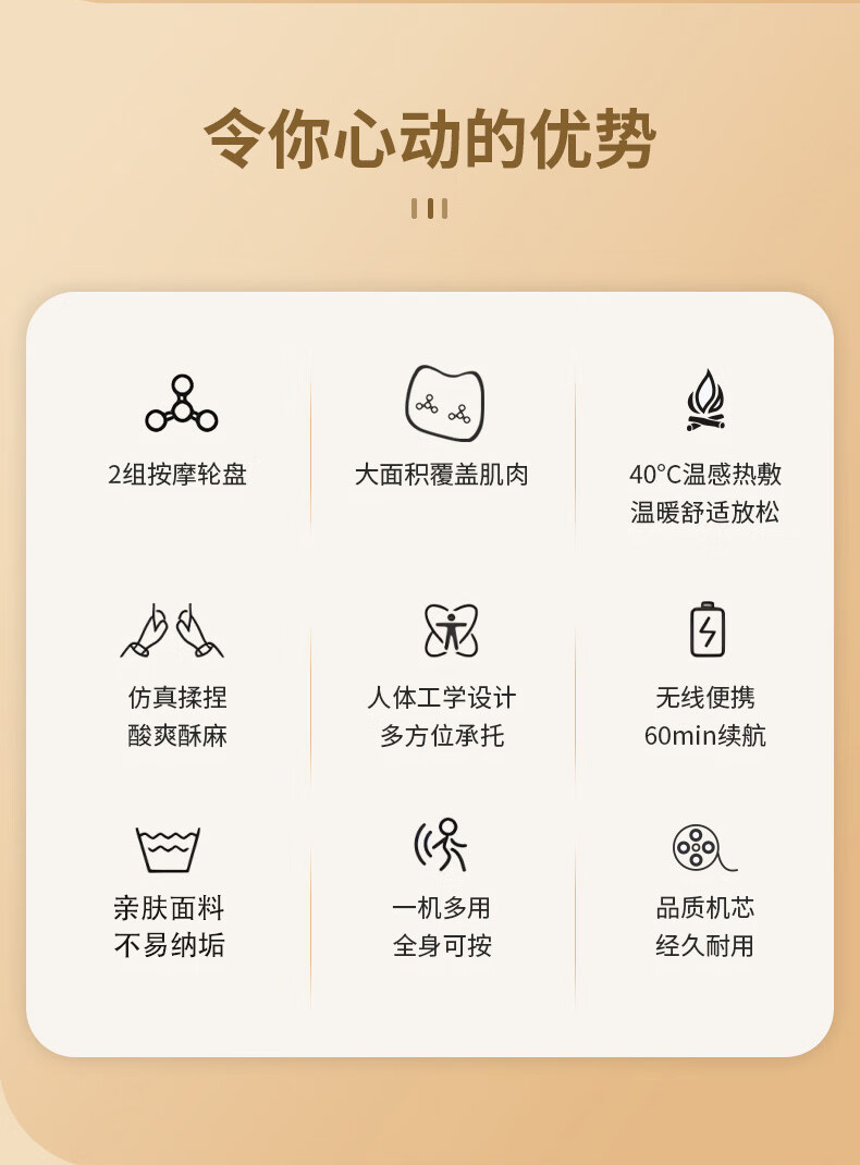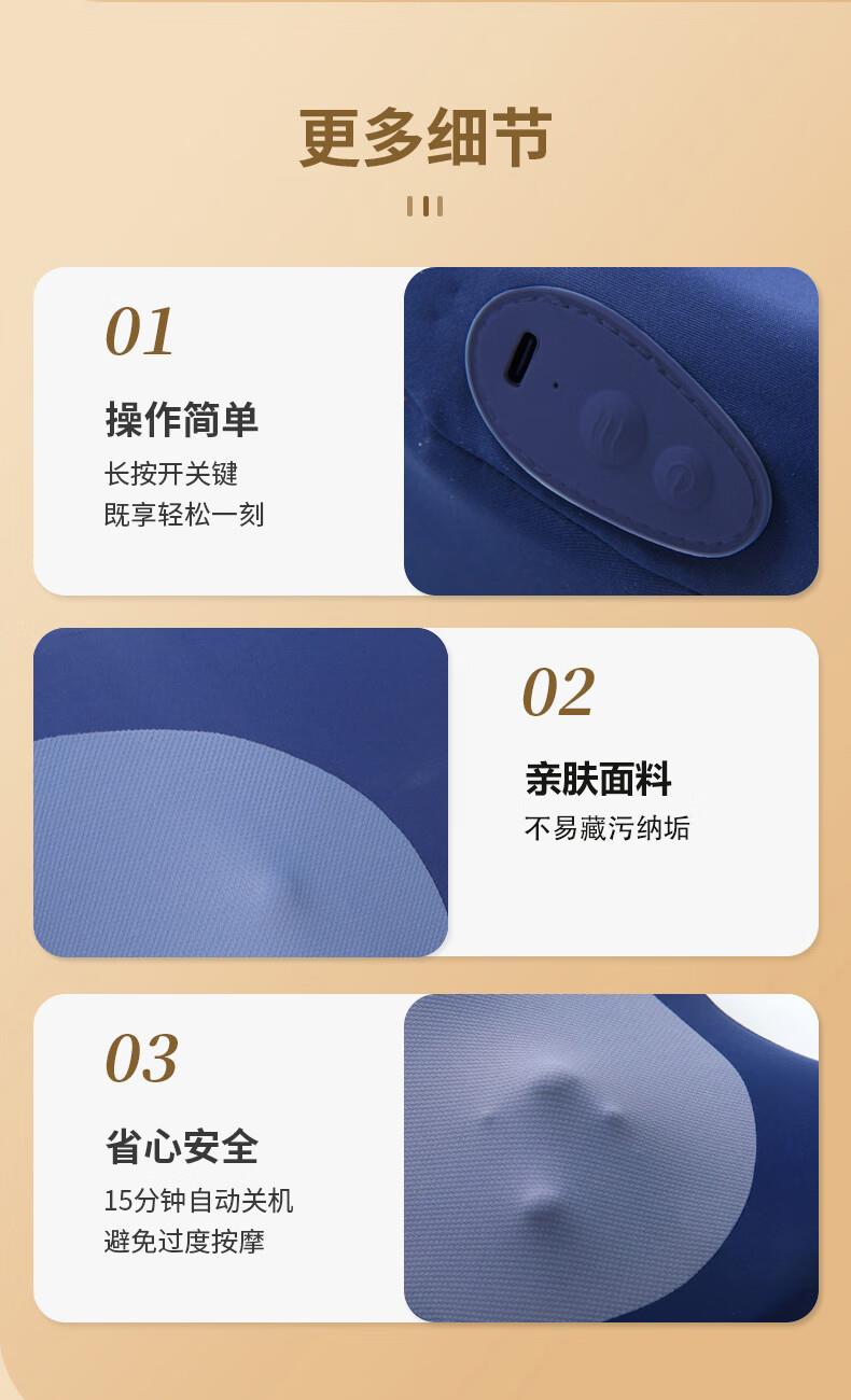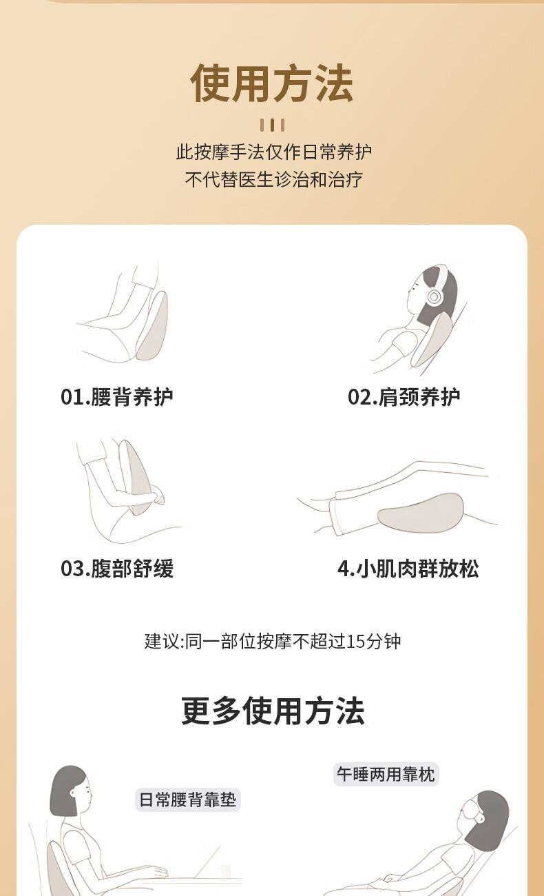 续 航: 约5个循环(单循环15min) 充电时间:3小时±0.5小时 充电电压:5V1A 额定功率:9w 工作电压:7.4V 充电接口:Type-C 电池容量:1800毫安 配件:按摩枕,充电线,说明书 执行标准:GB4706.12005/GB4706.10-2008